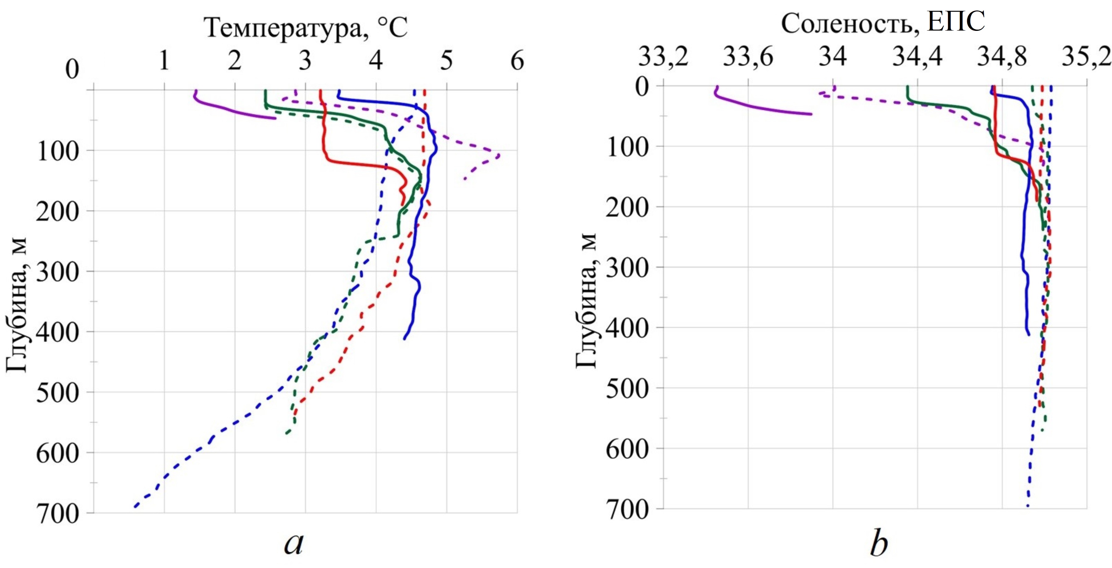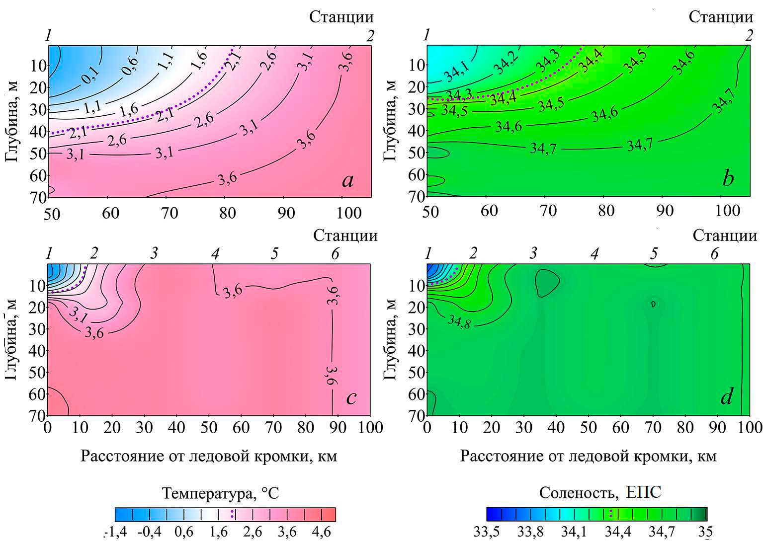 5. Fig.4. Vertical distribution of temperature (left) and salinity (right) in the Marginal Frontal Zone on the sections in 2019 (a, b) and 2023 (c, d). Purple dotted line denotes the isotherm and isohaline along which the frontal sections of temperature and salinity run