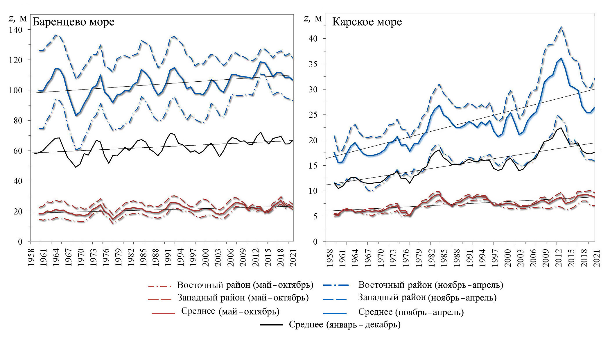 Анализ межгодовой изменчивости среднегодовых значений толщины ВКС в Баренцевом и Карском морях показал также наличие положительного климатического тренда в 1958–2022 гг., т. е. рост толщины ВКС. Тенденция увеличения толщины ВКС прослеживается как в холодное, так и в теплое полугодие. Величина тренда среднегодовой толщины ВКС для Баренцева моря составил 1,3 м/10 лет, для Карского 1,2 м/10 лет. В холодное полугодие скорость роста толщины ВКС для Баренцева и Карского морей составила 1,9 м/10 лет и 2,1 м/10 лет, в теплое полугодие 0,7 м/10 лет и 0,4 м/10 лет соответственно.