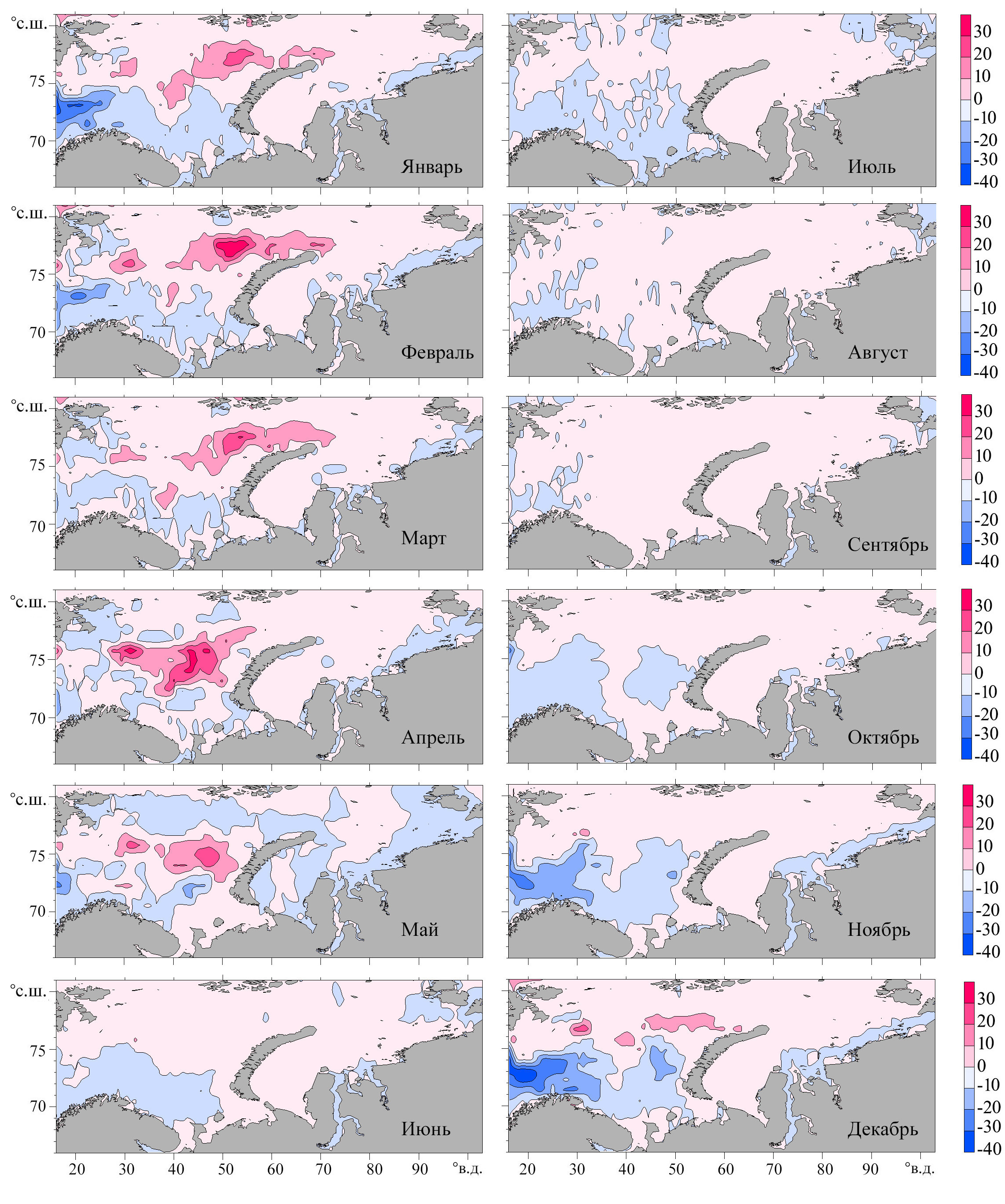 Сезонные изменения трендов толщины ВКС в Баренцевом и Карском морях имеют региональные особенности (рис. 5). В наиболее динамически активном западном районе Баренцева моря, куда поступает устойчивый поток атлантических вод, наблюдаются наибольшие отрицательные тренды изменения толщины ВКС, ее уменьшение прослеживается во все месяцы года. В январе оценки линейного тренда достигают –32 м/10 лет.