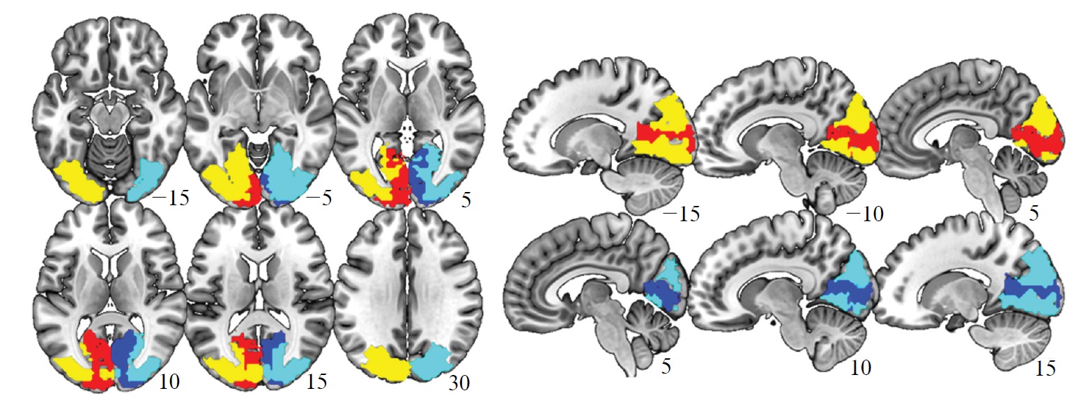 Примечание. Красным цветом обозначено поле Бродмана 17 левого полушария, синим — правого; желтым — поля Бродмана 18+19 левого полушария, голубым — правого. Маски наложены на стандартный шаблон головного мозга в пространстве MNI.