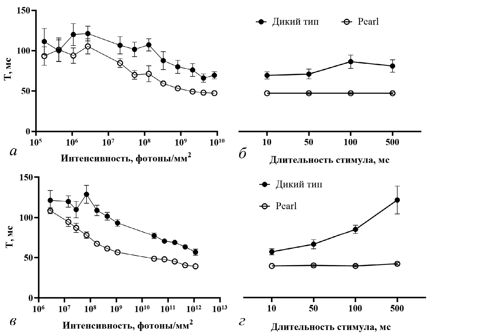 Рис. 6. Время до пика ЭРГ тараканов в ответ на короткие вспышки (1—10 мс) зеленого (а, б) и УФ (в, г) света возрастающей интенсивности. Для максимальной интенсивности света приведены времена для стимулов возрастающей длительности (б, г). Показаны средние и ошибки среднего.