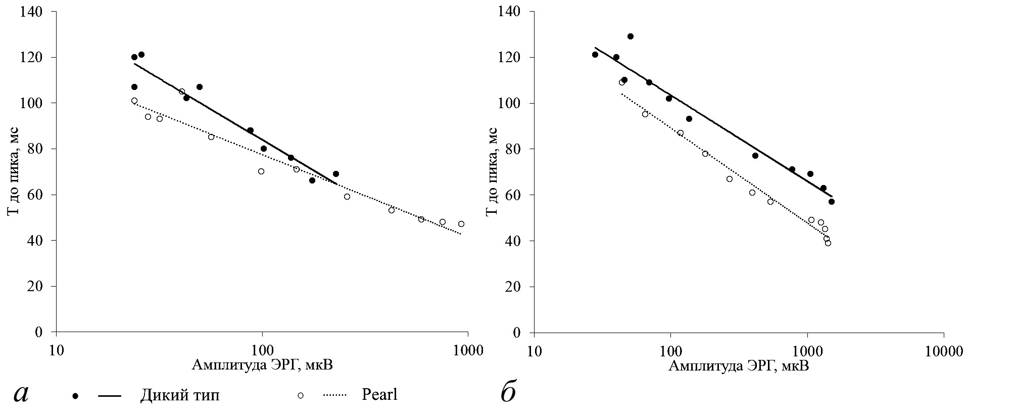 Белоглазые тараканы демонстрировали существенно более высокую чувствительность к свету, а именно ответы, превышающие уровень шума, обнаруживались в ответ на меньшие интенсивности света обеих длин волн, при этом амплитуды ответов были в несколько раз больше, чем у особей дикого типа. Таким образом, полученные данные подтверждают ранее наблюдавшееся кратное увеличение амплитуды ЭРГ у белоглазых мутантов (Gribakin, 1988; Chen et al., 1999). Кажущееся противоречие с данными, полученными при внутриклеточных отведениях (Saari et al., 2018), которые демонстрируют более низкие ответы на свет фоторецепторов из глаз мутантов pearl по сравнению с диким типом, объясняется увеличением потока света, достигающего фоторецепторных мембран и, соответственно, вкладом большего числа фоторецепторов в суммарный электрический ответ глаза.
