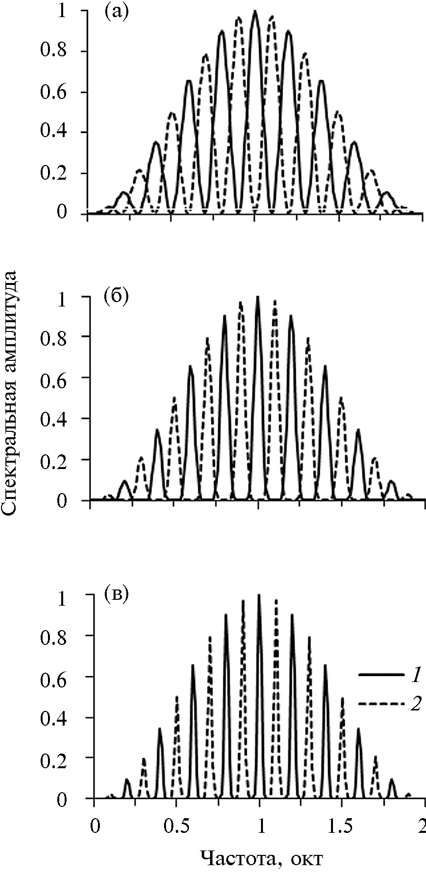 Рис. 1. Характеристики фильтров, примененных для синтеза гребенчатых сигналов, с разной шириной гребней. Плотность гребней 5 цикл/окт. Эквивалентная ширина гребней: а — 37% от частотного интервала между соседними гребнями; б — 16%; в — 9% (показатели степени в уравнении (1) соответственно 1, 4 и 16). 1 и 2 — варианты характеристик с противоположными положениями спектральных максимумов и минимумов на шкале частот.