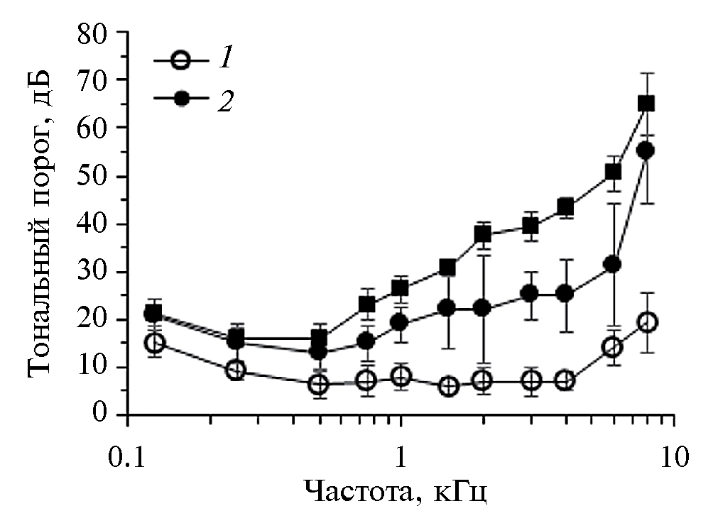 Во всех трех группах испытуемых наблюдали повышение порогов на высоких частотах (см. рис. 2). Однако частоты, начиная с которых происходило явное повышение порогов, различались: от 4 кГц для группы с нормальным слухом (см. рис. 2, 1) до 0.5 кГц у группы с умеренной и сильной потерей слуха (см. рис. 2, 3); группа со слабой потерей слуха характеризовалась промежуточным положением усредненной аудиограммы (см. рис. 2, 2).