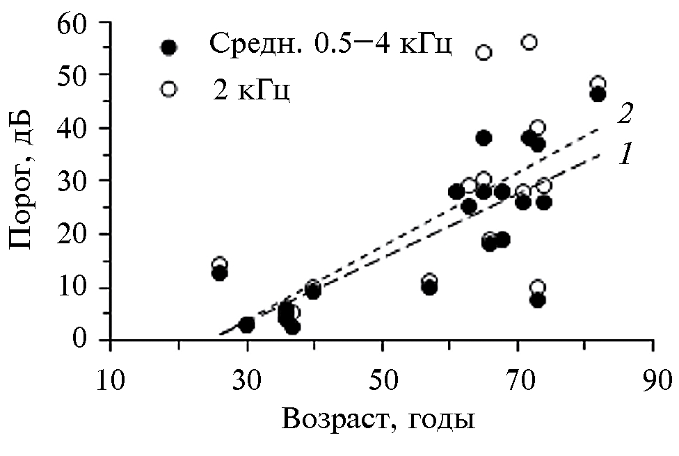 Для усредненного порога на частотах 0.5–4 кГц наклон линии регрессии и соответствующая стандартная ошибка составили 0.62±0.14 дБ/год, для частоты 2 кГц 0.74±0.20 дБ/год. Наряду с указанной тенденцией наблюдали значительный разброс данных, т.е. у испытуемых близких возрастов тональные пороги могли значительно различаться.
