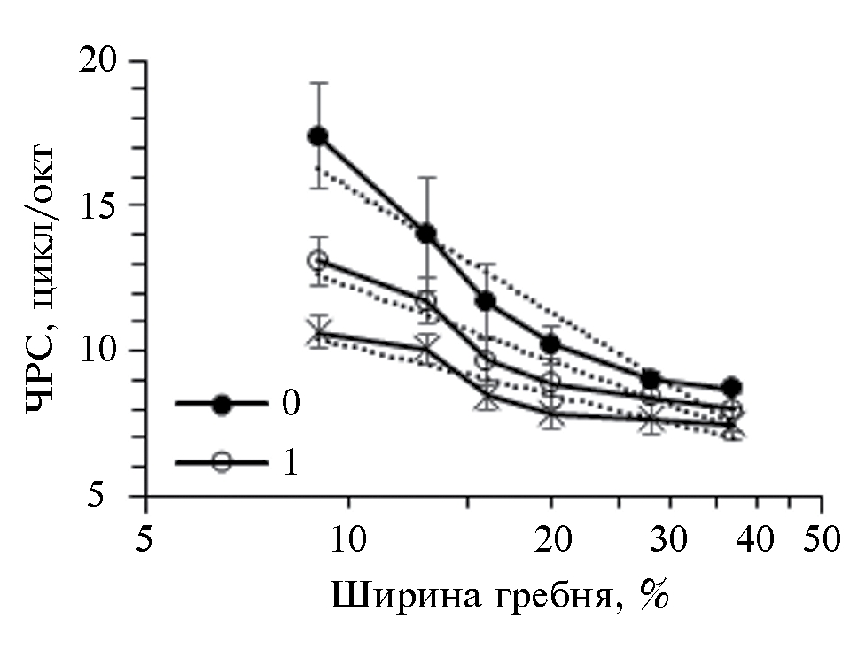 У испытуемых с нормальным слухом сужение гребней спектра приводило к значительному повышению ЧРС: усредненная зависимость аппроксимируется линией регрессии с наклоном –0.28 (цикл/окт)/% и стандартной ошибкой 0.1 (цикл/окт)/%. Отрицательный наклон линии регрессии отражает то обстоятельство, что чем больше ширина гребня, тем хуже разрешение. У испытуемых с умеренной и значительной потерей слуха этот эффект был значительно слабее (наклон линии регрессии и стандартная ошибка –0.11±0.05 (цикл/окт)/%). У испытуемых с легкой потерей слуха зависимость имела промежуточный характер: наклон линии регрессии –0.17±0.06 (цикл/окт)/%.