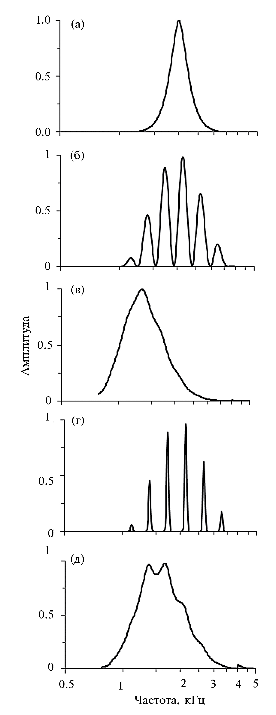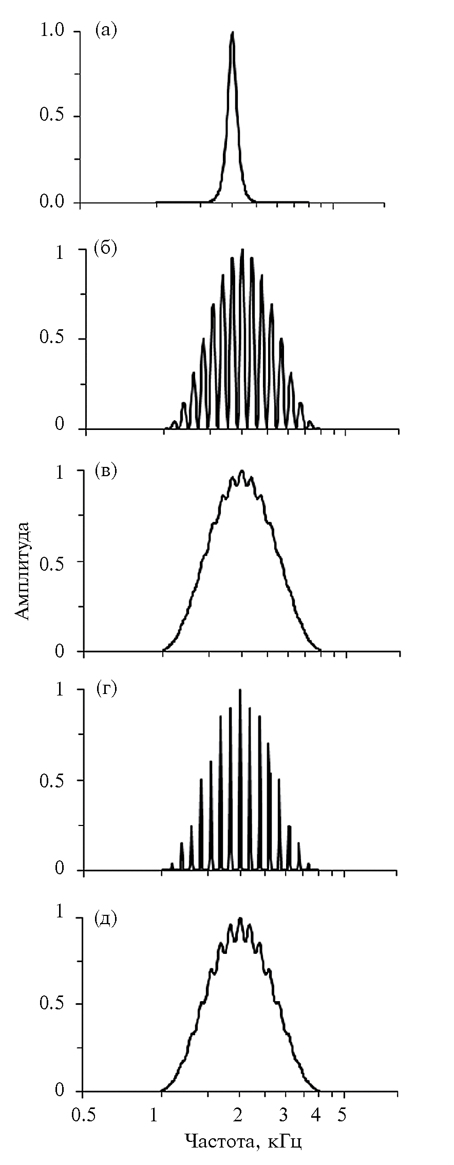 Увеличение глубины модуляции профиля возбуждения воспроизводилось в данном исследовании моделью спектрального различения. Для моделирования использована форма кохлеарных фильтров, аппроксимированная функцией скругленной экспоненты (roex) (Patterson et al., 1982). В соответствии с формулой, описывающей зависимость полос пропускания кохлеарных фильтров от центральной частоты (Glasberg, Moore, 1990), принимали, что на частоте 2 кГц полоса пропускания составляла 237 Гц (приблизительно 12% от центральной частоты, или 0.16 октавы). Расчет показал (рис. 5), что при узких гребнях спектра входного сигнала (рис. 5, г) профиль возбуждения имеет более глубокую модуляцию (рис. 5, д), чем при широких гребнях (рис. 5, б и в).