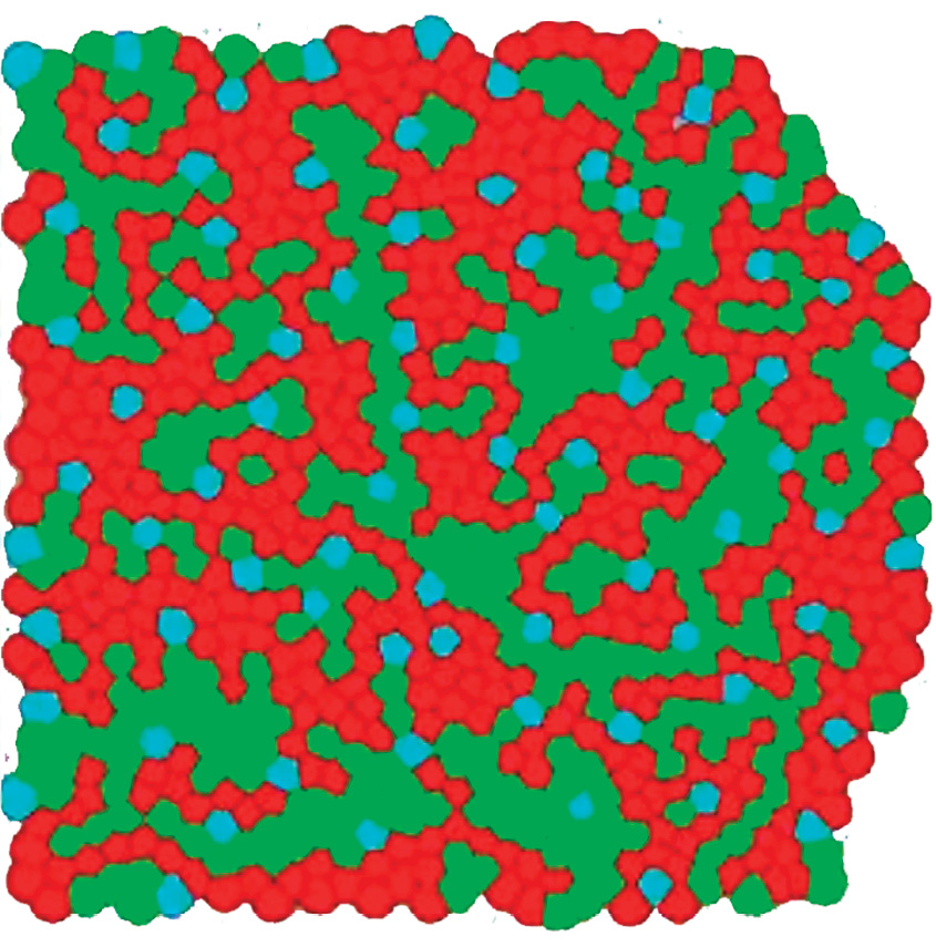 Рис. 1. Схематическое изображение фрагмента реальной мозаики колбочек из сетчатки обезьяны Macaca fascicularis. Рисунок сделан по данным статьи (Roorda et al., 2001). В модели механизма суммации нейронных изображений использовали список координат и спектральных типов 904 колбочек реального фрагмента сетчатки. Фрагмент расположен на расстоянии 1.5 угл. град. от центра фовеа. Его размер – 36×36 угл. мин (0.125×0.125 мм). Плотность колбочек – около 70 000 на мм2; среднее расстояние между ними приблизительно равно 1.2 угл. мин (4 мкм)
