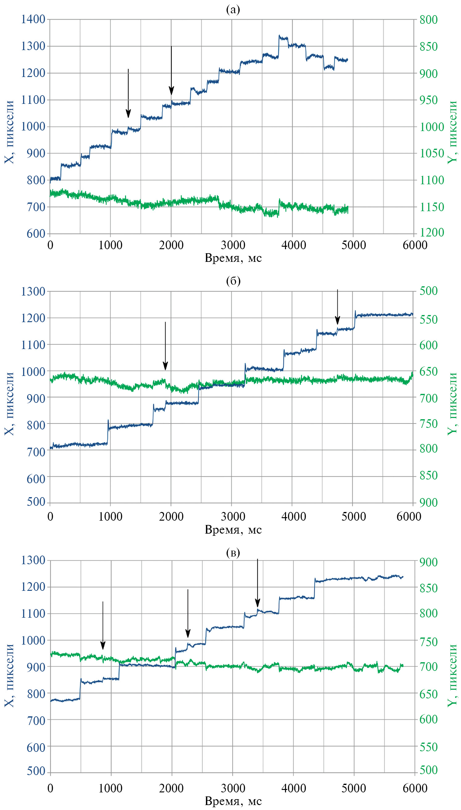 Типичные записи движений обоих глаз испытуемых при однократном просматривании букв слева направо и узнавании предъявляемого слова, представлены на рис. 3. Это данные регистрации движений глаз трех испытуемых школьного возраста. Желтые горизонтальные линии на рисунке указывают положение центров букв (Х-координаты) на экране монитора. Макроскачки от буквы к букве и фазы фиксации взора на каждой из букв хорошо выделяются на записях. На протяжении этих фаз видны небольшие плавные смещения глаз по горизонтали и вертикали. Согласно полученным данным, характерным для фазы фиксации одной буквы было наличие одной-двух микросаккад. Во многих фазах фиксации букв микросаккады отсутствовали. В единичных случаях их число достигало трех.