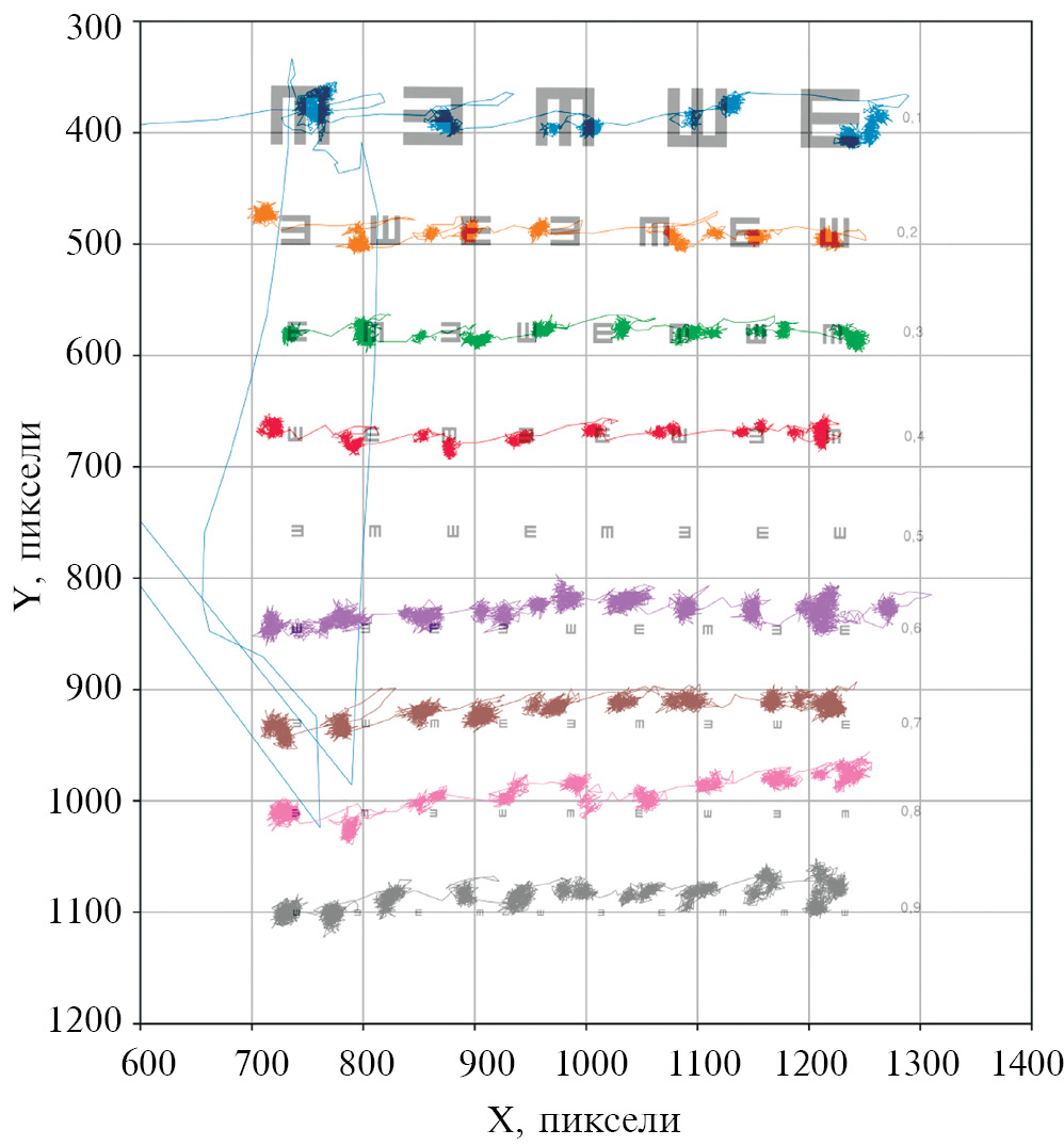 Анализируя представленные на рис. 6 записи, можно видеть, что при фиксации крупных знаков области фиксационных движений были по площади меньше, чем при фиксации мелких знаков. С уменьшением размера оптотипов, время их просмотра заметно увеличивалось, чем отчасти может объясняться увеличение площадей, покрытых траекториями движений глаз в процессе фиксации отдельных тестовых знаков. Кроме того, это увеличение может быть связано с увеличением амплитуды микродвижений глаз в условиях затрудненного узнавания.