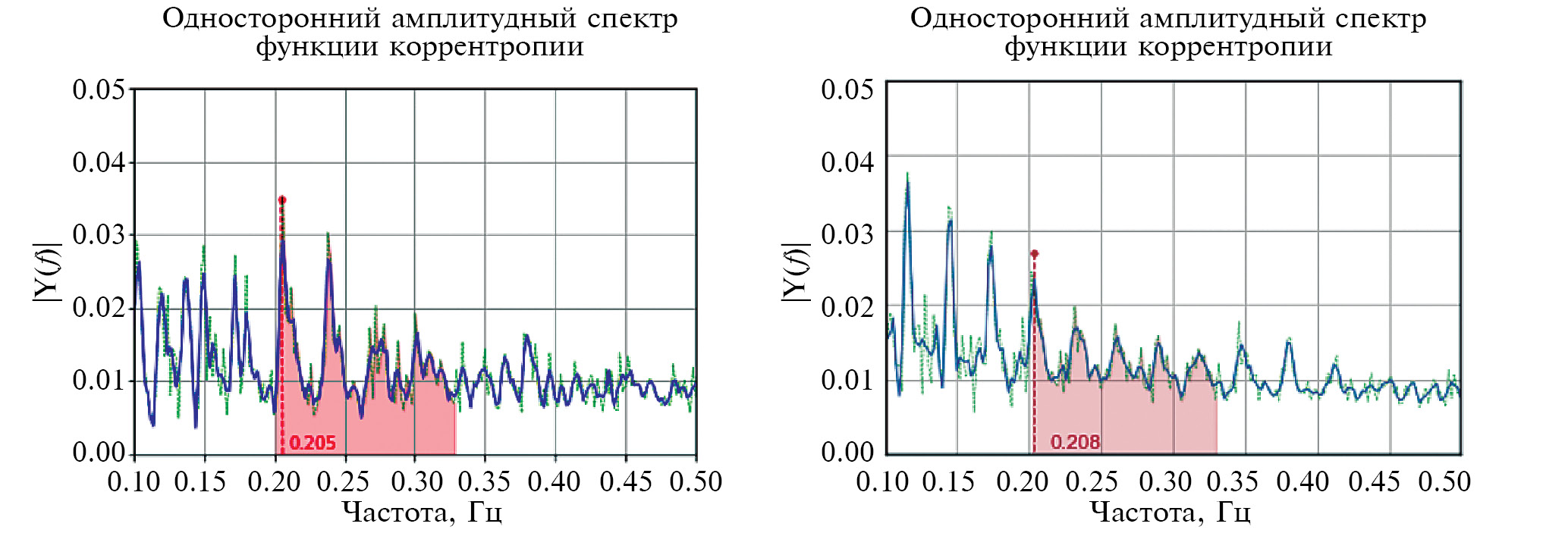 Рис. 5. Графики спектров функции коррентропии двух пульсовых волн (слева спектр для 1-й волны, справа – для 2-й) с отмеченным значением измеренной частоты дыхания (синим цветом показана кривая сглаженных значений, красным цветом закрашен диапазон частот дыхания D)