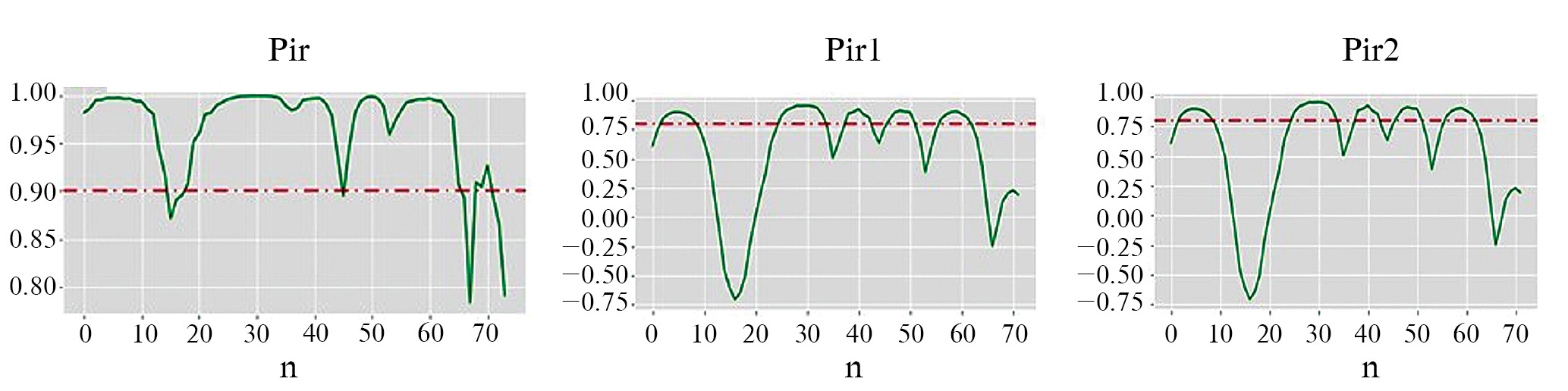 Точность оценки частоты дыхания зависит от натяжения браслета на кисти руки. Влияние величины натяжения браслета исследовалось применительно к двум задачам: оценки ЧДД и исследованию сатурации. Для анализа натяжения браслета предложено использовать значения корреляции Пирсона (Pir) между волнами IR и Red (инфракрасного и красного) излучателей датчика биомониторинга, а также значения корреляции Пирсона между значениями соседних 15 с скользящих окон волн IR и Red (Pir1 и Pir2). При этом критерий основан на оценке не превышения функциями корреляции порогов, соответствующих допустимому натяжению браслета (в данном случае показаны пороги: 0.9, 0.8, 0.8) на рис. 6.