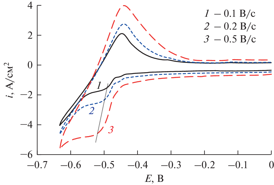 Электрохимическое поведение скандия в галогенидных расплавах представляет интерес как с точки зрения разработки новых электрохимических способов получения скандия и материалов на его основе, так и с точки зрения имитации электрохимического поведения продуктов деления при пирохимической переработке отработавшего ядерного топлива в расплавленных солях. Методами циклической вольтамперометрии, квадратно-волновой вольтамперометрии и хронопотенциометрии изучены закономерности электровосстановления ионов скандия в зависимости от параметров электролиза расплава LiF–CaF2–ScF3 при температуре 800°С. Показано, что электровосстановление скандия в исследуемом расплаве происходит при потенциалах отрицательнее –0.45 В относительно потенциала алюминиевого электрода, при этом электроосаждение скандия на электроде способствует электровосстановлению катионов лития с деполяризацией. При анализе полученных поляризационных зависимостей отмечено, что процесс электровосстановления скандия протекает в одну 3-х электродную стадию, при этом не является электрохимически обратимым. Сделано предположение, что причиной необратимости является стадия образования новой фазы. В результате электрохимических измерений сделан вывод, что благодаря широкому “электрохимическому окну” расплав LiF–CaF2 может быть использован для электрохимического синтеза скандия и для изучения закономерностей совместного или селективного электровосстановления минорных актинидов и лантаноидов.