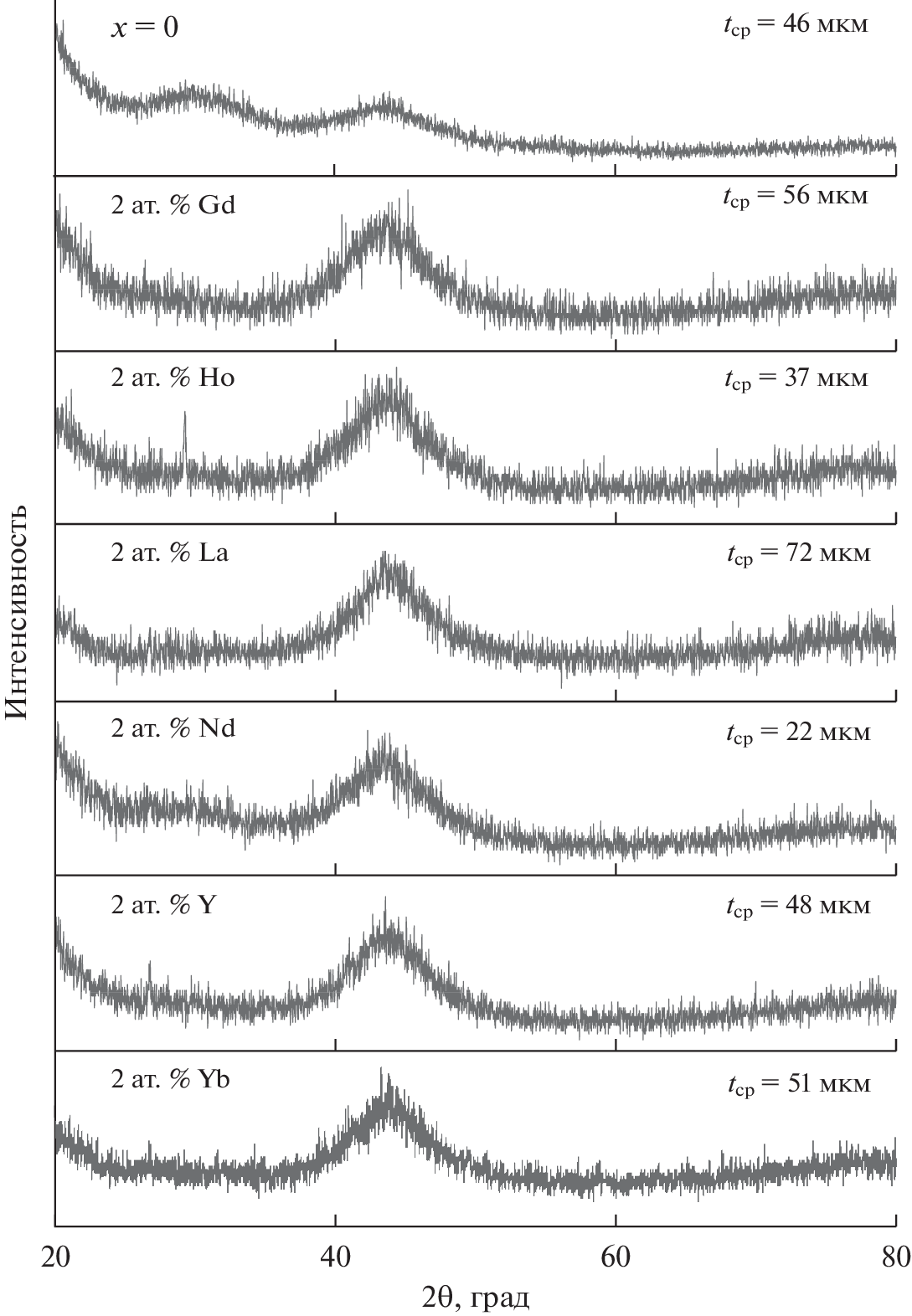 Эвтектические сплавы из-за своей низкоплавкости являются перспективными материалами для получения металлических стекол. В отличие от кристаллических сплавов, в стеклах отсутствует дальний порядок, что приводит к повышению твердости, механической прочности, коррозионной стойкости и магнитной проницаемости. Возможности использования данных материалов на практике регламентируются критическим диаметром, при котором еще возможно образование однофазного металлического стекла при закалке. Поэтому актуальной задачей в этой области исследований является повышение критического диаметра имеющихся аморфных сплавов. Одним из методов улучшения стеклообразующей способности сплавов является их разбавление более тугоплавкими металлами. В данной работе представлены рентгеноаморфные металлические стекла сплавов (Co41Fe7Cr15Mo14C15B6)100 – xRx с разбавлением редкоземельными металлами (R = Gd, Ho, La, Nd, Y, Yb; x = 0; 2). Методами рентгеновской дифракции и сканирующей электронной микроскопии установлен критический диаметр, фазовый и элементный состав сплавов в зависимости от скорости закалки. Установлено, что добавление 2 ат. % Gd, Ho и Y значительно увеличивает стеклообразующую способность сплава Co–Fe–Cr–Mo–C–B. Методом спиннингования, при закалке на алюминиевом диске, вращающемся с линейной скоростью 11.5 м/с, получены ленты толщиной от 19 до 73 мкм. На поверхности лент были обнаружены редкие включения с высоким содержанием редкоземельных элементов вплоть до 35 ат. %, которые могут выступать в качестве центров кристаллизации.