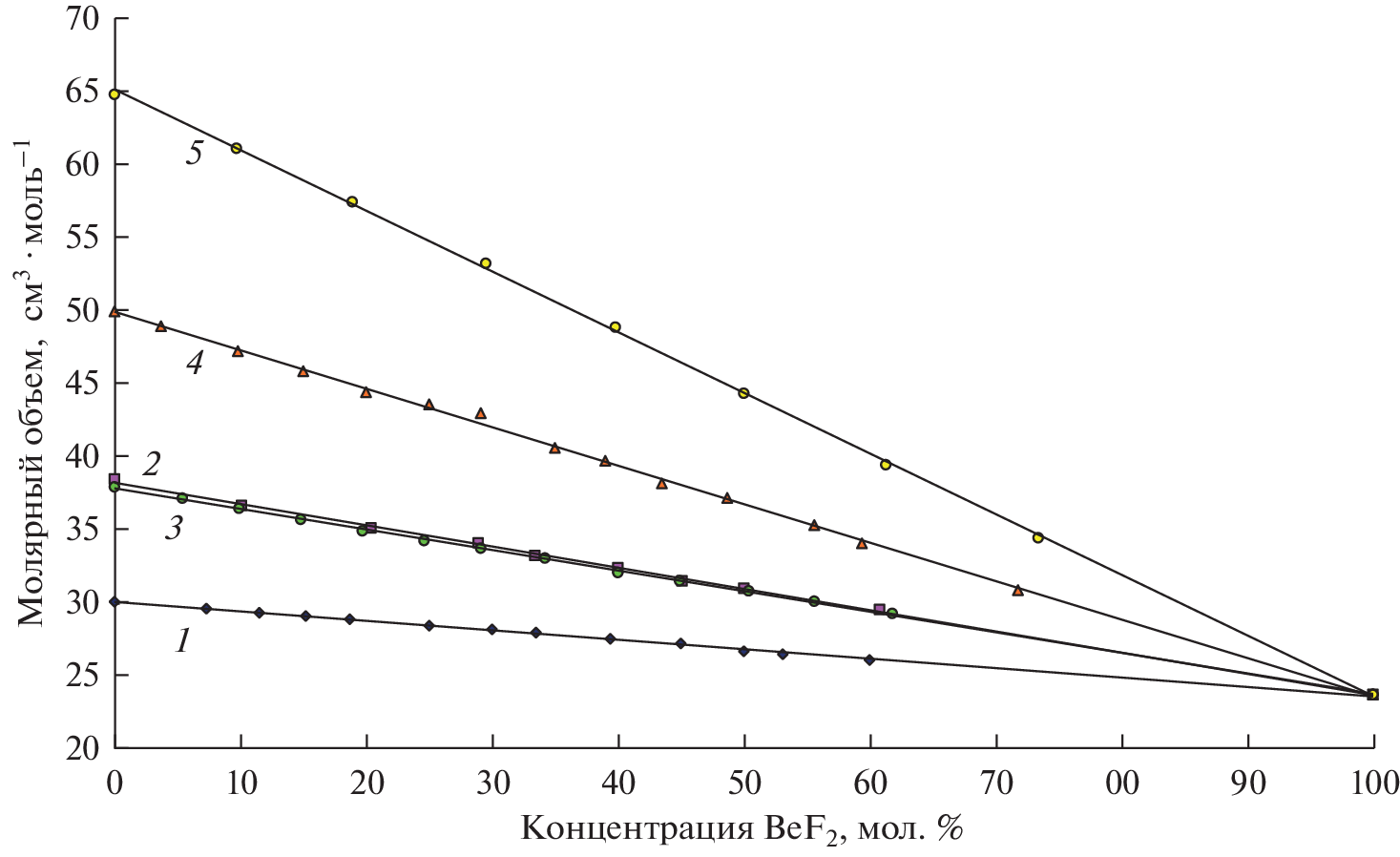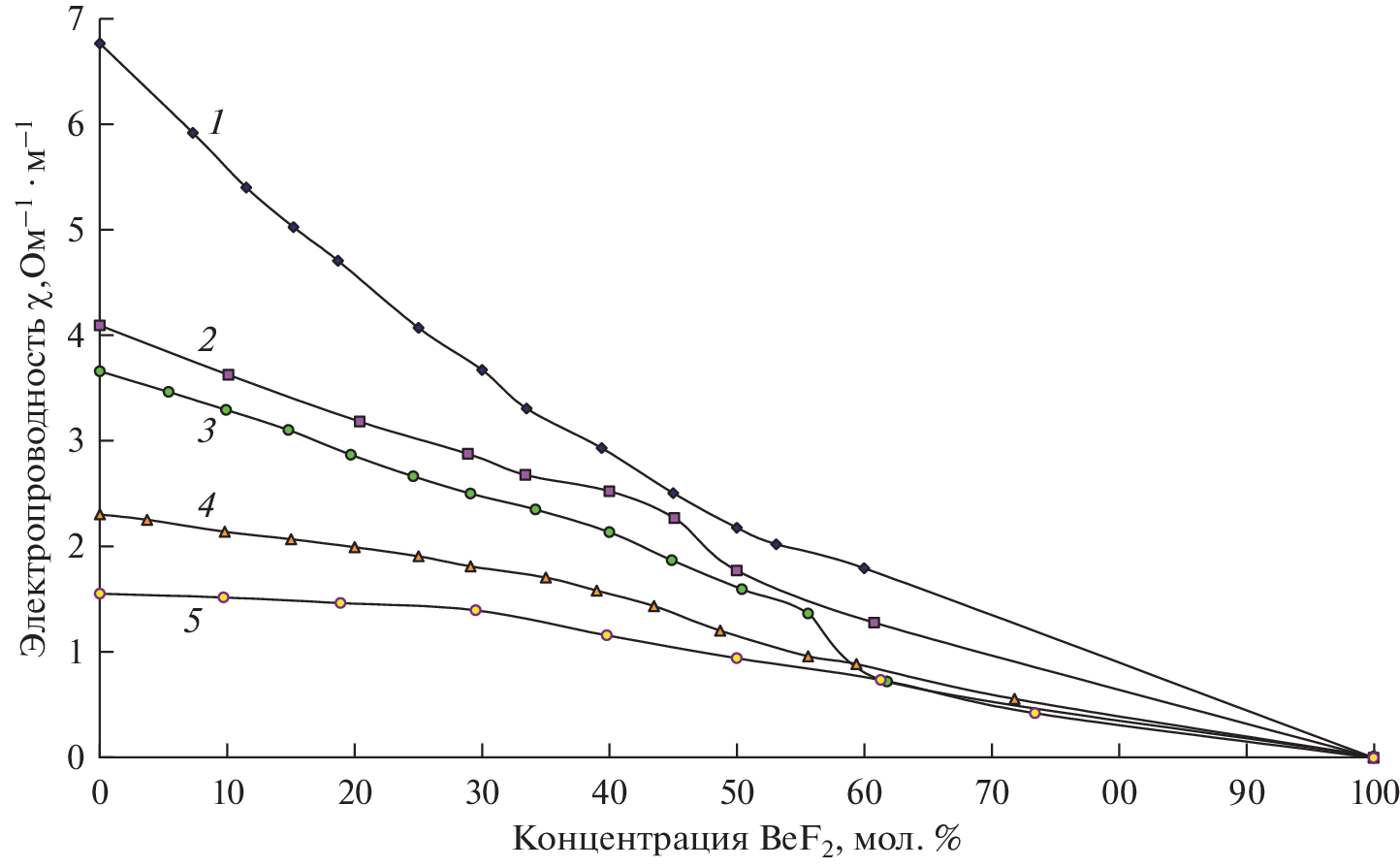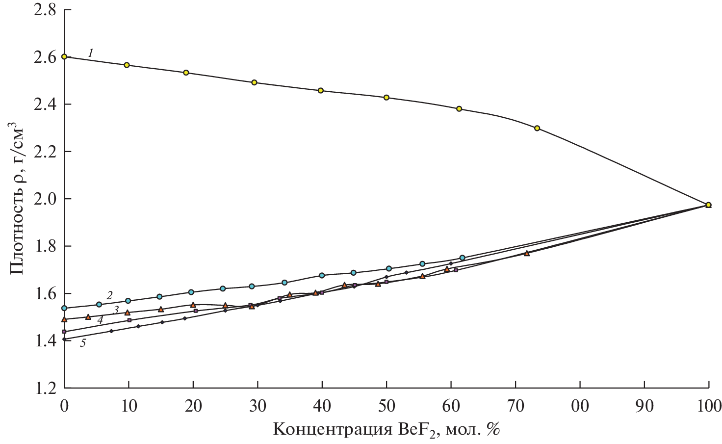 Сведения о плотности и электропроводности солевых расплавов представляют интерес как для оценки возможности их использования для электролитического получения и рафинирования бериллия и других технологических процессов, так и анализа возможного взаимодействия компонентов. Данные о плотности расплавленных солевых систем, содержащих фторид бериллия и хлориды щелочных металлов, получены методом гидростатического взвешивания. Шар-поплавок и нить подвеса были выполнены из платины. В качестве материала тигля и чехла термопары использовали окись бериллия. В системах BeF2–MeCl (Me = Li, Na, K, Cs) и BeF2–(Li–K)эвт–Cl исследовано от 9 до 14 расплавленных солевых смесей, содержащих от 0 до 100% фторида бериллия, при повышении температуры на 100–200 К от температуры плавления смеси со средним шагом 10 К. В связи с особенностями поведения индивидуального фторида бериллия при нагревании выше температуры плавления (высокая вязкость и интенсивное испарение) плотность расплавленной соли измеряли методом максимального давления в газовом пузырьке. Одновременно с плотностью капиллярным методом была измерена электропроводность этих расплавов. Материал измерительной ячейки – окись бериллия, измерительные электроды – платиновые стержни диаметром 1 мм. Постоянную ячейки определяли и регулярно контролировали по расплаву высокочистого хлорида калия. Все операции по подготовке солевых смесей, отбору проб для химического анализа и измерение свойств проводили в изолированной атмосфере сухого и дополнительно очищенного аргона. Результаты измерений представлены на графиках и в форме полиномов первого и второго порядка, отражающих зависимость плотности и электропроводности от температуры для различных составов солевых смесей. Значения одновременно измеренных величин плотности и электропроводности использовали для расчета молярного объема и молярной электропроводности электролитов. Изотермы молярного объема имеют практически линейный характер, что указывает на слабое взаимодействие компонентов расплава. Изотермы молярной электропроводности имеют характерный перегиб в области составов, содержащих около 30 мол. % фторида бериллия, что может быть связано с образованием комплексных соединений в жидкой фазе.