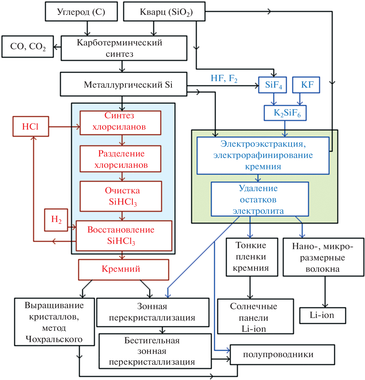 Благодаря своей распространенности в природе и свойствам, кремний является одним из самых востребованных материалов в различных отраслях промышленности. В настоящее время металлургический кремний получают карботермическим восстановление кварца, который затем подвергают гидрохлорированию и многократному хлорированию для получения солнечного кремния. В данном кратком обзоре представлен анализ альтернативных методов получения кремния электролизом расплавленных солей. Рассмотрены факторы, определяющие выбор состава расплавленных солей, типичные осадки кремния, полученные электролизом. Выполнена оценка результатов и перспектив дальнейшего использования электроосажденного кремния в литий-ионных источниках тока и репрезентативные результаты испытаний по использованию электролитического кремния в устройствах преобразования солнечной энергии. Отмечены задачи, которые необходимо решить для практической реализации методов электролитического производства образцов кремния, пригодных для новых устройств и материалов преобразования и накопления энергии.