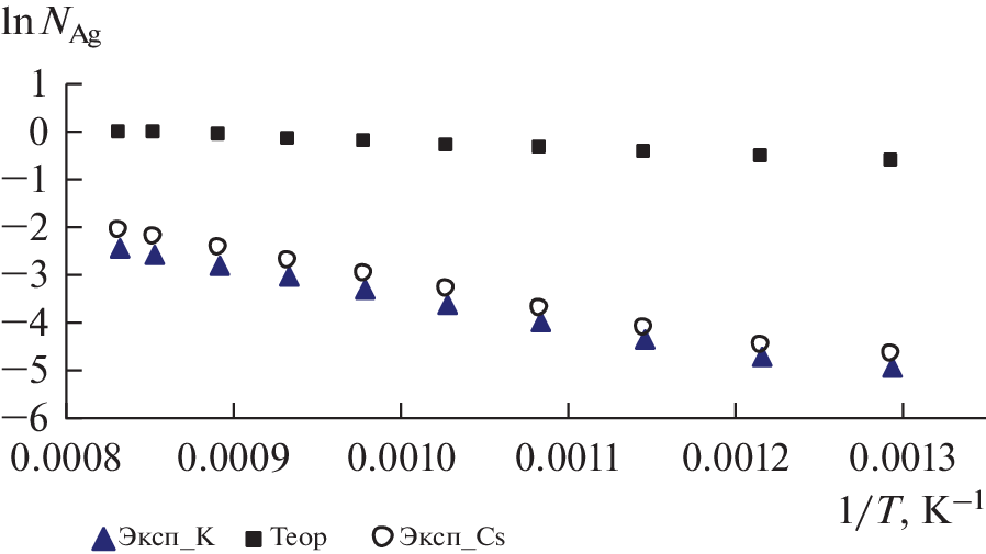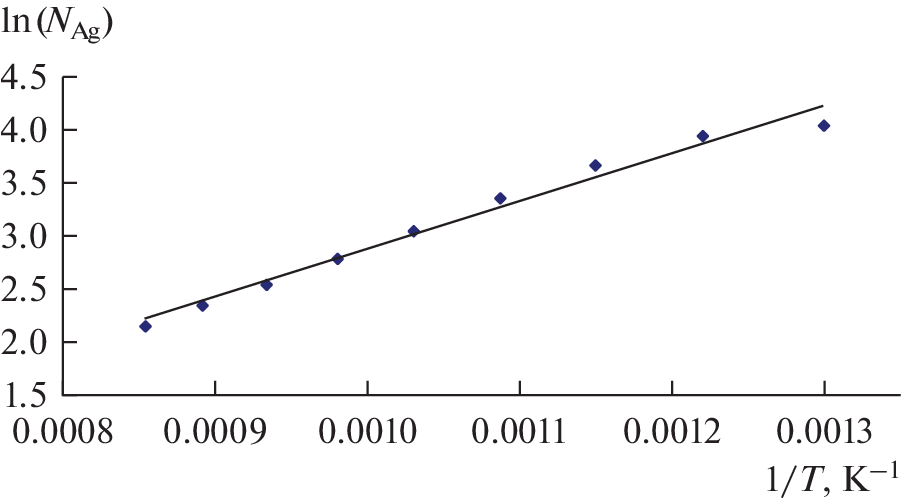 For a number of years, the Institute of High-Temperature Electrochemistry of the Ural Branch of the Russian Academy of Sciences has been determining the solubility of silver depending on temperature both in individual potassium and cesium, and with additions to these alkali metals of their halides. At the beginning of the study, they were assumed to be corrosive due to the prevailing opinion in the literature about the low solubility of silver in potassium and even less in cesium. In this work, it is shown that the solubility of silver in cesium is greater than in potassium. Here are measurements of the solubility of silver in liquid cesium at temperatures from 500 to 900°C. The average value of solubility for each temperature varied from 0.94 to 11.1 mol % Ag, respectively. Experimental data on the solubility of silver in cesium are approximated by a polynomial of the second degree. NAg = 6.066 · 10–5T2 – 5.966 · 10–2T + 15.58, where NAg is silver solubility in mol %, Т is temperature in °C. In this article, using data on the solubility of silver in cesium and the ideal Schroeder solubility equation, the values of the activity coefficients of silver and the partial enthalpy of mixing of silver and its partial excess entropy in these solutions were obtained. They are respectively equal: \({{\overline {\Delta H} }_{{{\text{Ag}}}}}\) = 38 154.8 J/mol and \({{\overline {\Delta S} }_{{{\text{exAg}}}}}\) = 14.215 J/(mol · K). The Schroeder equation was used under the assumption that the enthalpy of silver melting is independent of temperature. The values of the logarithm of the silver activity coefficient versus temperature are approximated by the equation: ln(yAg) = 4589 · 1/T – 1.7097. Approximation error R2 = 0.9818.