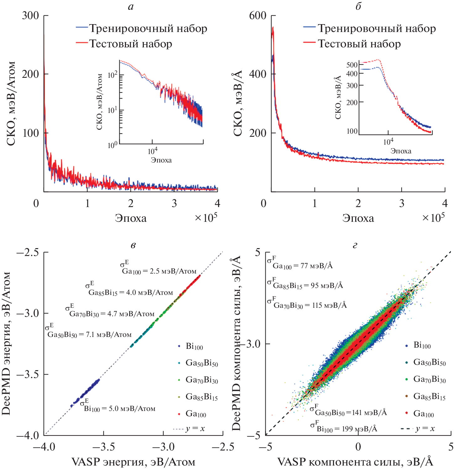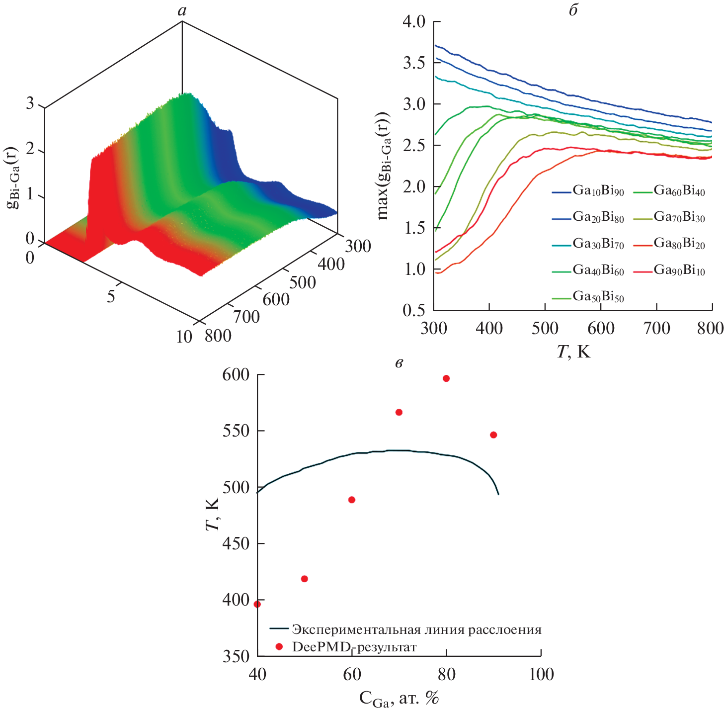 В данной работе впервые методом молекулярно-динамического моделирования был рассмотрен процесс расслоения в расплавах системы Bi-Ga. Взаимодействие между атомами задавалось при помощи параметризованного по ab initio данным нейросетевого потенциала (модель DeePMD). Параметризация DeePMD-потенциала была выполнена с использованием алгоритма активного машинного обучения. В ходе молекулярно-динамического моделирования расплавы составов GaxBi100 – x где x = 0, 10, …, 90, 100 были охлаждены от 800 до 300 К. Расслоение регистрировалось по характеру изменения парциальной радиальной функции распределения для пары Ga–Bi. Установлено, что DeePMD-потенциал, в исходный тренировочный набор которого не было введено конфигураций, соответствующих расслоенному состоянию, все равно способен воспроизводить расслоение в системе Bi-Ga. При этом, концентрационный диапазон расслоения, определяемый по молекулярно-динамическому моделированию с DeePMD-потенциалом совпадает с экспериментом. Также удалось верно определить смещение максимума купола расслоения в сторону расплавов, богатых галлием. Тем не менее максимум купола расслоения определен недостаточно точно, как Ga80Bi20, вместо экспериментального Ga70Bi30. Помимо этого, определенный температурный диапазон купола расслоения шире, чем в эксперименте. Несмотря на это, использование нейросетевых потенциалов в атомистическом моделировании, как это показано в настоящей работе, может быть эффективно использовано для прогнозирования расслоения в бинарных металлических системах.