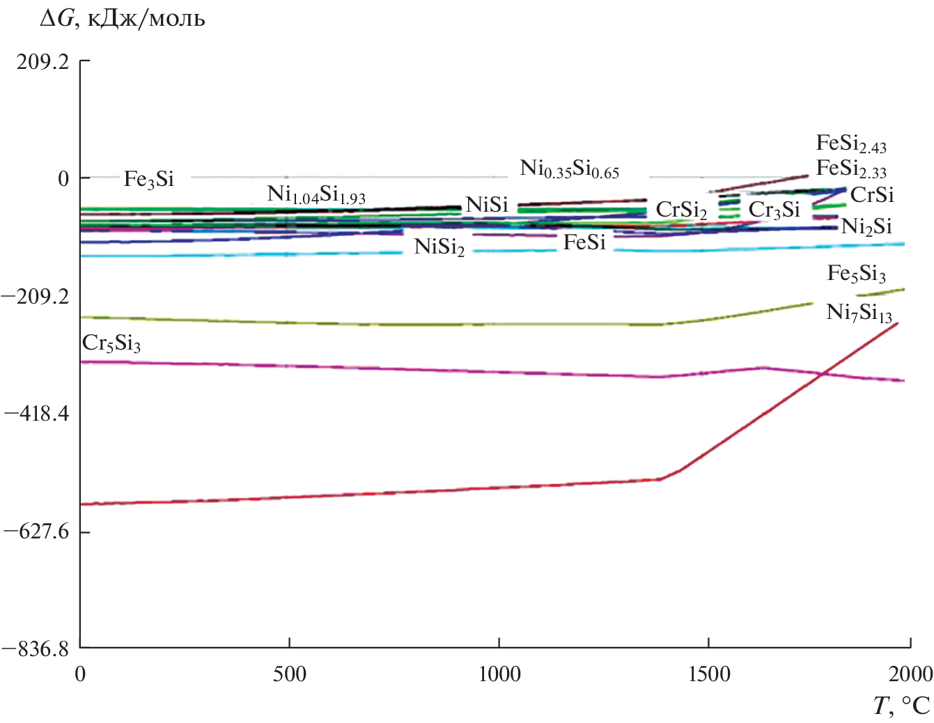 To determine thermochemical characteristics: enthalpy, molar heat capacity and Gibbs energy of formation of silicides, borides and carbides in an alloy of a given composition (40Fe–31Ni–16Cr–5Cu–5Si–2B–1C) calculation methods were used using mixed GGA and GGA + U schemes (semi-empirically tuned generalized gradient approximations). Three modules of the HSC Chemistry 6.0 software package (Metso Outotec, version 6.0, Espoo, Finland) were used in the study. First, the “Reaction Equation” module was used to calculate the change in Gibbs free energy at different temperatures. Secondly, to calculate the composition of each chemical in the equilibrium state, the module “Equilibrium Composition” was used (“Equilibrium compositions” – calculation of equilibrium compositions of phases in the presence of reversible chemical reactions). Thirdly, the module “H, S, C and G diagrams” (“Graphs of thermodynamic functions” – plotting thermodynamic functions) was used to determine the relative phase stability of compounds depending on temperature in the form of Ellingham diagrams. The results of thermochemical modeling showed that the temperature dependences of the heat capacity of the formation of hardening compounds in the alloy increase with increasing temperature. Thermodynamic calculations of the enthalpies of the hardening phases in the alloy showed that at temperatures >1400°C, silicides, borides, and carbides are formed. ∆G(T) of silicides, there is an increase in the values of the Gibbs energy and a tendency towards stability with increasing temperature. During the formation of borides in the alloy, one can see a strong absorption of heat, an increase in the Gibbs energy in the studied temperature range. The results of calculating the Gibbs energy as a function of temperature showed the formation of carbides Ni3C, Fe3C, SiC, B4C, Cr3C2, Cr4C, Cr7C3. The formation of phases occurs with a decrease in the values of the Gibbs energy to a temperature of ~1500°C. A further increase in temperature indicates the absorption of heat, which is associated with a high ordering temperature of the carbide structures. Thus, the thermochemical study justified the formation of silicides, borides, carbides in the alloy 40Fe–31Ni–16Cr–5Cu–5Si–2B–1C.
