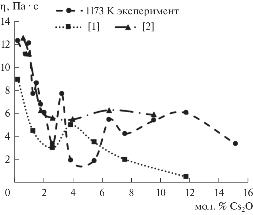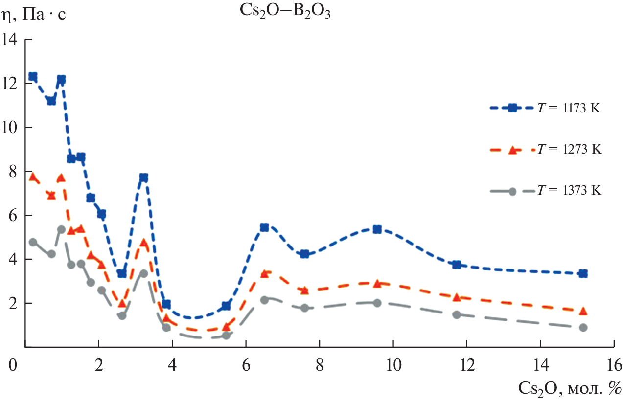 Effective viscosity (viscoelasticity) of cesium and boron oxides melts was measured at temperatures 900–1600 K and concentrations 0 ≤ x ≤16 mol % Cs2O by vibration viscosimetry. It was shown that vibration leads to non-Newtonian flow of melts. This means that not only configuration activation energy, the switching energy of bridging oxygen bonds but also the elastic energy of structural units of melts associated with activation energy of viscous flow. Using parameters under conditions of Newtonian and non-Newtonian flow of melts, shear viscosity η', elastic modulus G' and stored viscosity η'' were calculated. It was shown that cesium boron melts in conditions of high shear rates can be considered as liquids with viscous and elastic properties. Glass transition temperature (Tg, K) was measured by DSC, its dependence of content of cesium oxide was plotted and explained.