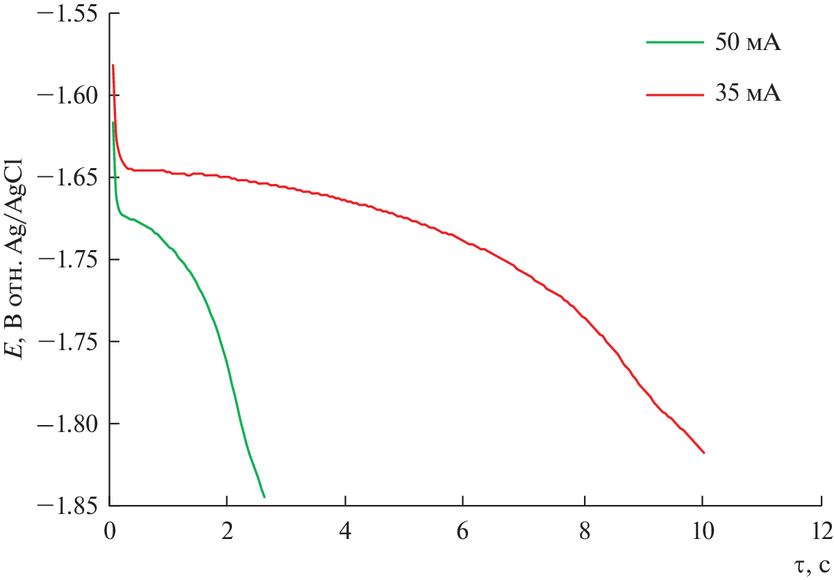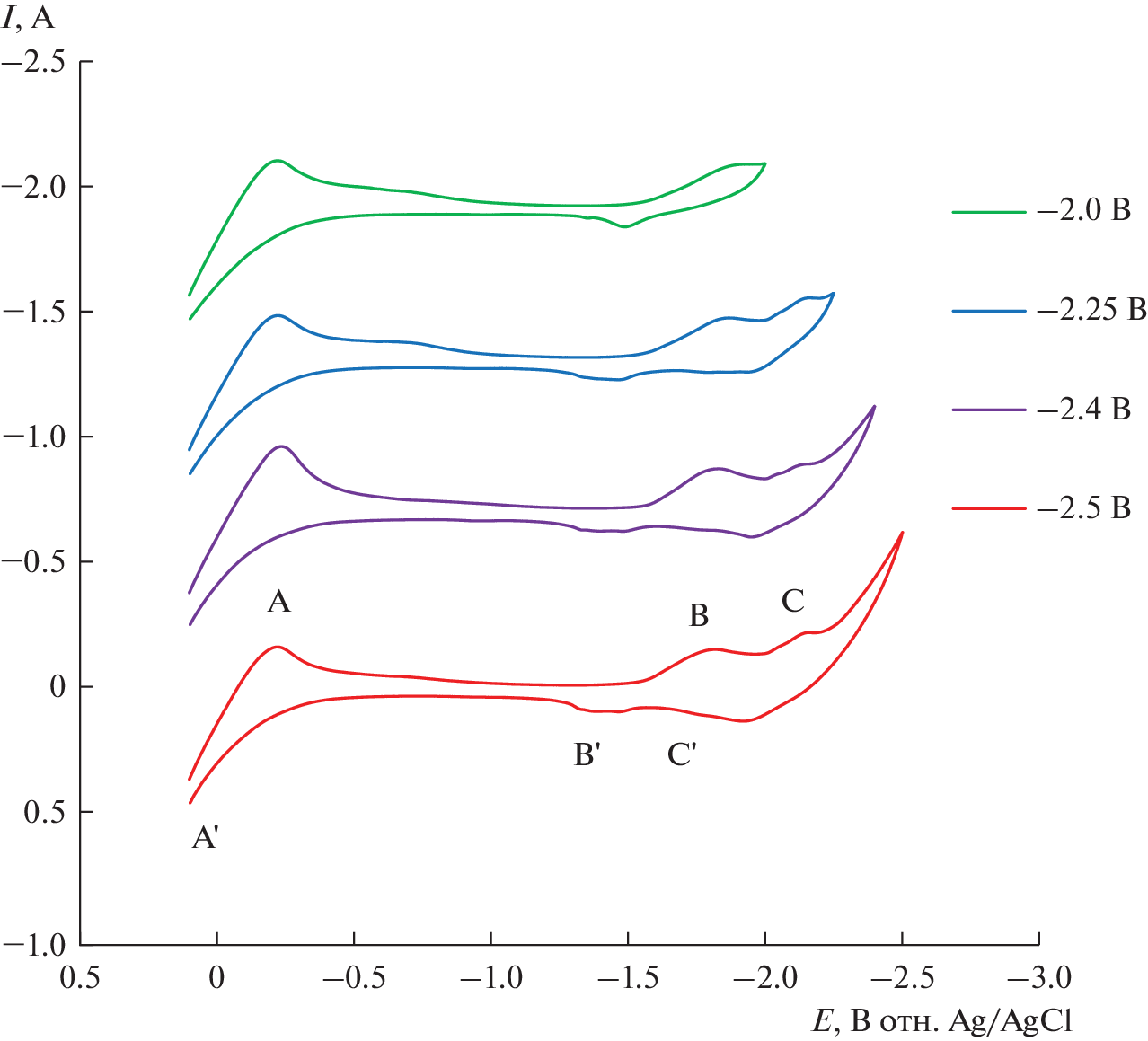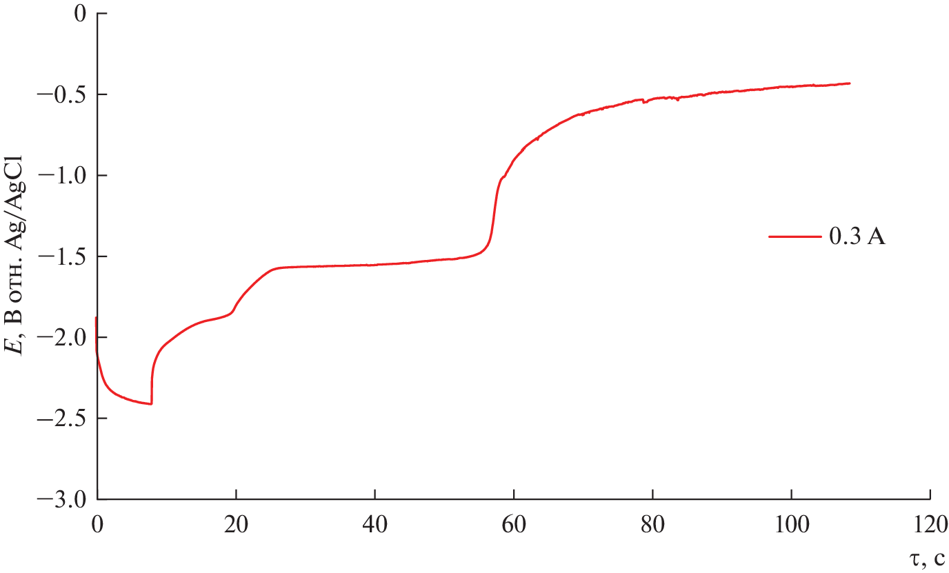 Исследовано электрохимическое поведение ионов лантана на никелевом электроде с использованием различных электрохимических методов, таких как циклическая вольтамперометрия, хронопотенциометрия, хронопотенциометрия разомкнутой цепи (кривые включения и выключения), квадратно-волновая вольтамперометрия в эквимольном расплаве хлоридов калия и натрия при температуре 973 K. На циклической вольтамперограмме имеется несколько волн восстановления на катодной ветви и соответствующие им волны окисления на анодной ветви. Первая волна А находится в области потенциалов –(0.0–0.1) В, на ней происходит восстановление ионов Ni2+. Вторая волна В находится в области потенциалов –(1.72–1.77) В, на ней происходит электровосстановление ионов \({\text{LaCl}}_{6}^{{3 - }}\) на никелевом электроде с определенной деполяризацией с образованием интерметаллида лантана с никелем LaxNiy. А появление третей волны С в области потенциалов –(2.09–2.13) В, связываем с электровосстановлением хлоридных комплексов \({\text{LaCl}}_{6}^{{3 - }}\) на интерметаллиде LaxNiy с образованием металлического лантана. На основании полученных данных показано, что при электровосстановлении хлоридного комплекса лантана в расплаве KCl–NaCl при Т = 973 K никелевый электрод взаимодействует с выделяющимся лантаном, вызывая существенную деполяризацию процесса электровосстановления хлоридного комплекса, также происходит образование интерметаллида с материалом Ni электрода.