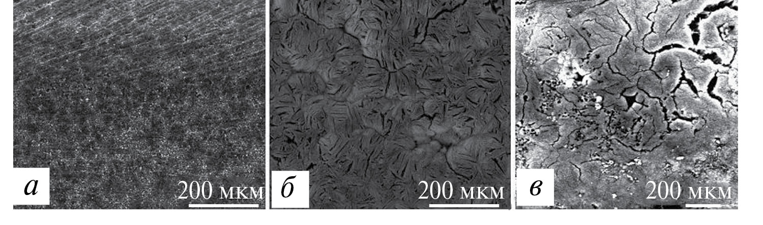 Рис. 3. Микрофотографии образцов кремния 3, 5 и 8, полученных в условиях гальваностатического электролиза расплава LiCl–KCl–CsCl–K2SiF6 с температурой 545 оС при разной длительности электролиза: а 30 мин при 25 мА/см2; б 60 мин при 25 мА/см2; в 180 мин при 50 мА/см2.