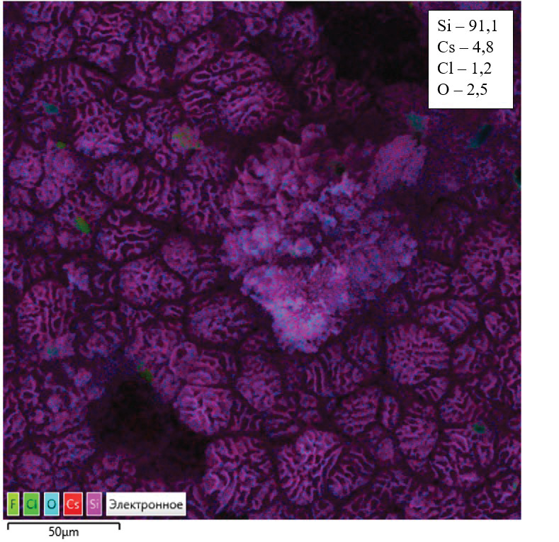 Согласно микрорентгеноспектральному анализу, пример которого приведен на рис. 5, полученные осадки на 90–98 мас.% были представлены кремнием с включениями остатков электролита (K, Cs, F, Cl), а также кислорода, появившегося в результате контакта кремния с атмосферой воздуха [20]. В данной работе не ставилась задача полной очистки осадков кремния от остатков электролита. При необходимости это может быть выполнено как путем отмывки в кислых растворах, так и методом высокотемпературной дистилляции.