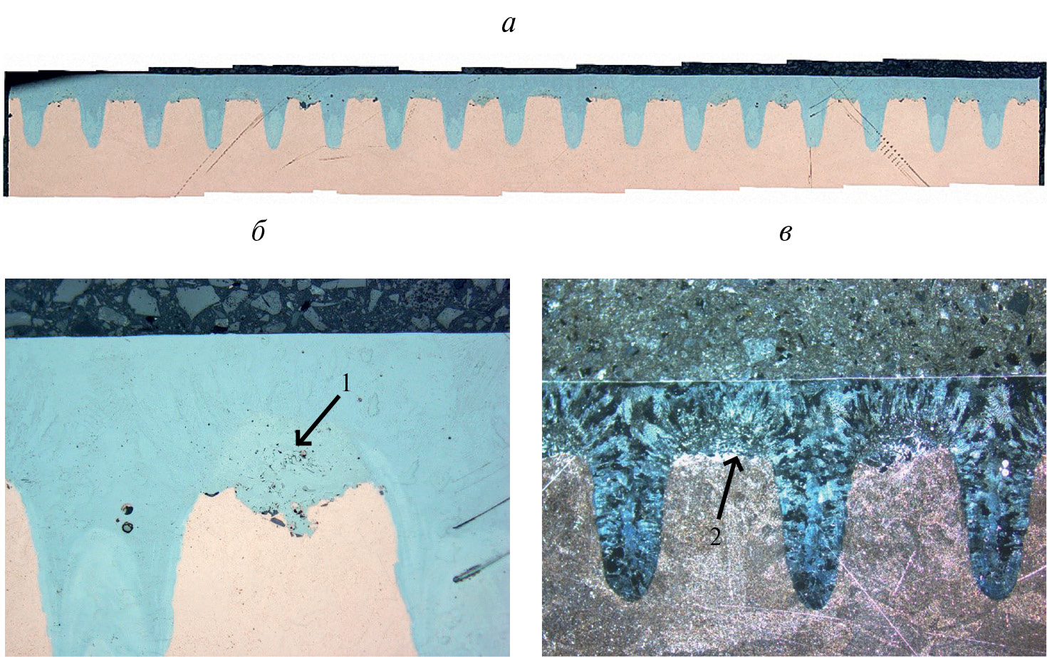 Рис. 4. Микрошлиф образца, режим 1. а – панорамный снимок; б – дефекты покрытия; в – снимок в режиме косого света; 1 – пористость внутри зоны сплавления, 2 – не оплавленное покрытие.