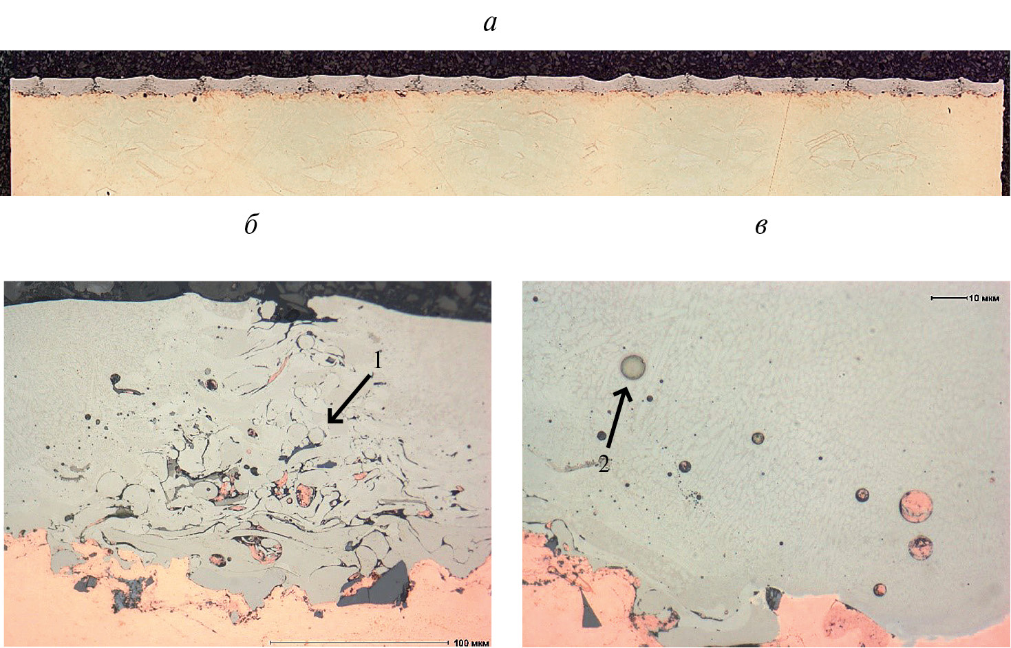 Рис. 5. Микрошлиф образца, режим 5. а — панорамный снимок; б, в — дефекты покрытия. 1 — не оплавленное покрытие, 2 — пористость оплавленного слоя.
