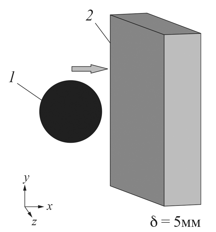Для численных расчетов использовалась мишень, смоделированная с помощью материала Джонсона–Кука в виде алюминиевой пластины Д16AM размером 25 × 30 мм с количеством слоев конечных элементов, равным 20 слоям, с толщиной 5 мм, закрепленной прижимом за боковые грани под углом соударения 90° (рис. 7).