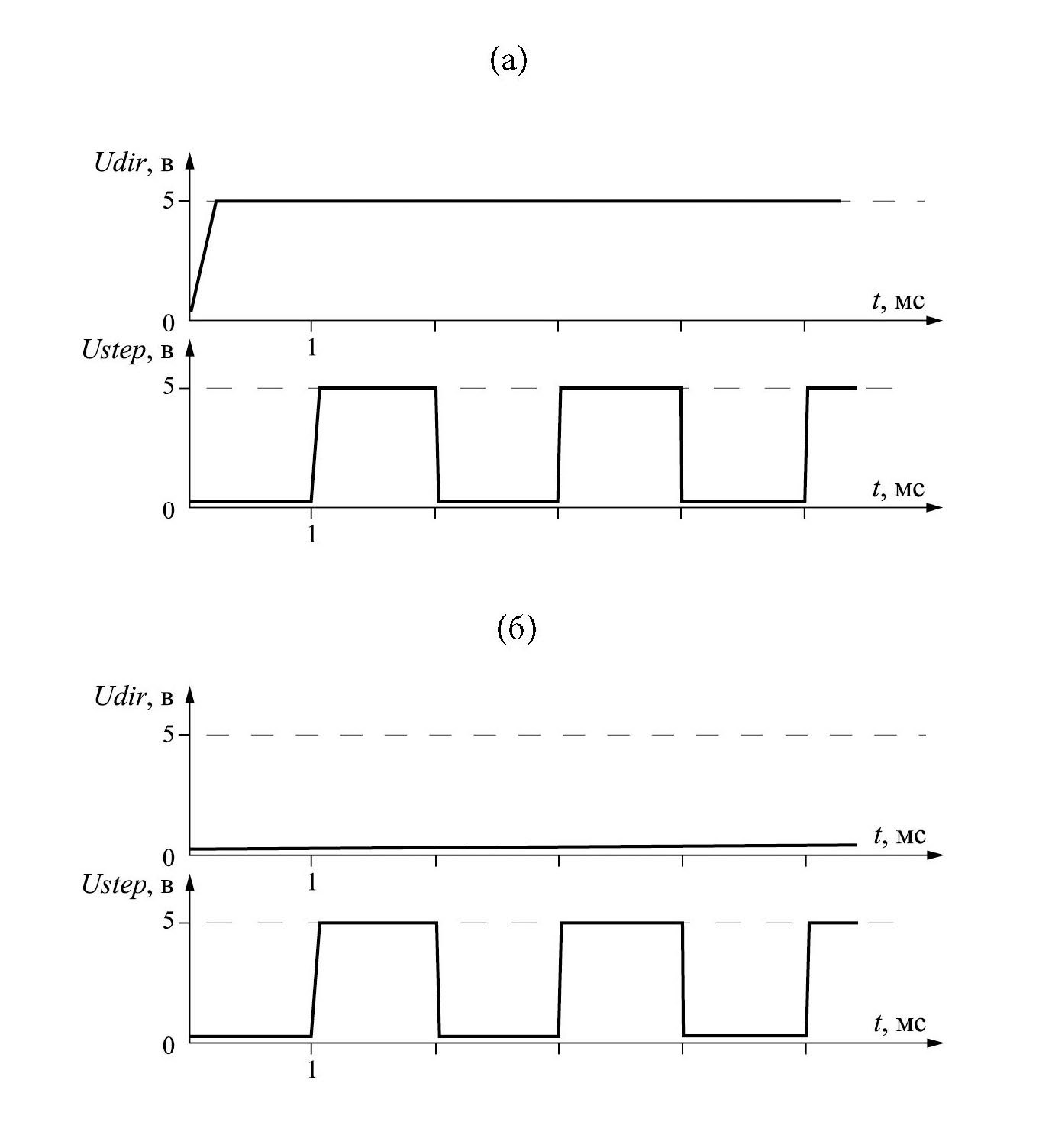 Рис. 2. Импульсы управления приводов наклона: (а) – в прямом направлении; (б) – в обратном направлении.