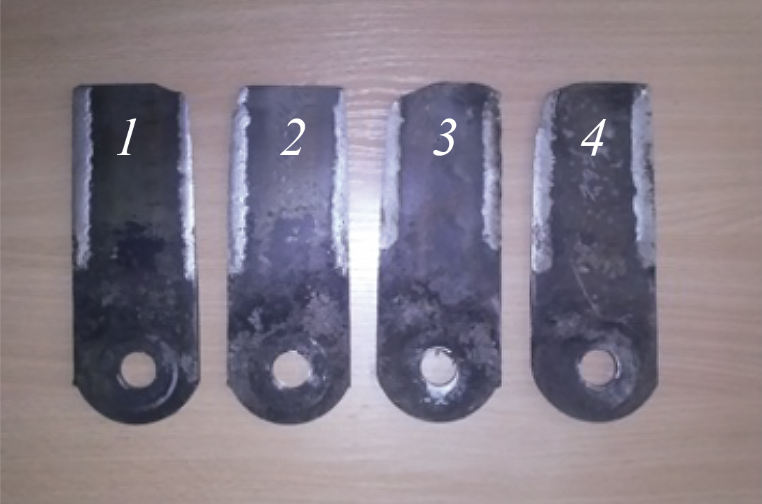 Рис. 1. Внешний вид изношенных контрольных ножей измельчителя-разбрасывателя комбайна Acros при различной наработке, га: 1 – 47; 2 – 110; 3 – 162; 4 – 225.