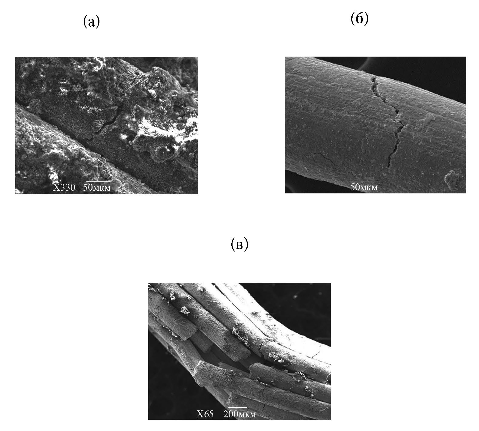 Рис. 1. Образование трещины медного проводника под действием токовой перегрузки: (а) – начальная стадия, увеличение ×330; (б) – развитие трещины, увеличение ×430; (в) – конечная фаза, разрушение проводника, увеличение ×65.