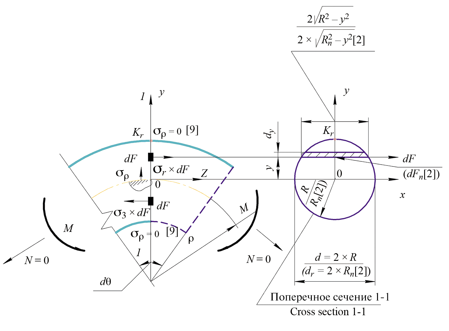 Для математического описания напряженно-деформированного состояния неупругого чистого изгиба моментом М медного стержня круглого поперечного сечения (рис. 2) [9, 10, 12–14] воспользуемся представленной в [10] моделью прочности, в основе которой: