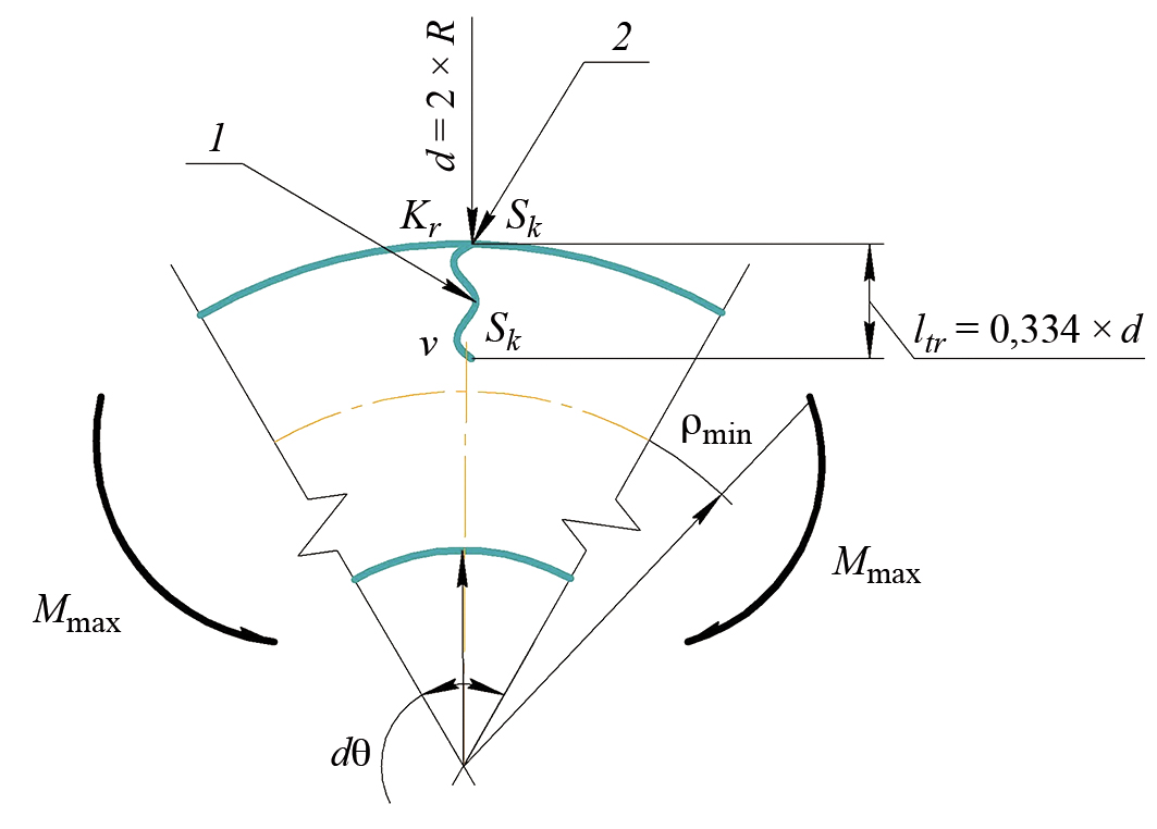 Рис. 5. Начальная стадия процесса разрушения в предельном напряженно-деформированном состоянии чистого изгиба моментом Mmax: 1 – трещина минимальной длины ltr; 2 – наиболее опасная точка.