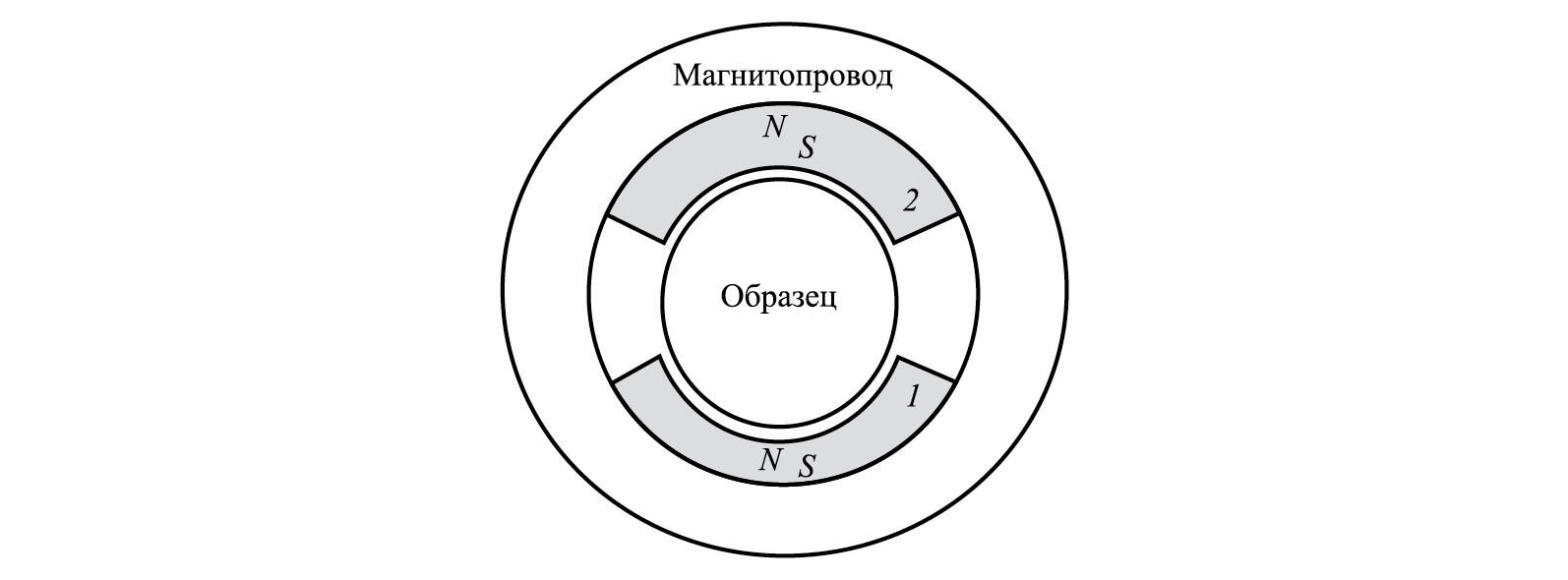 Для создания в образцах однородного магнитного поля использовалась намагничивающая система, схема которой показана на рис. 1. Основное требование к магнитной системе – обеспечение в образце однородной намагниченности и радиальной текстуры. Источниками магнитного поля служили постоянные магниты в виде сегментов из сплава SmCo5 марки КС-37 (ГОСТ 21559–76) с радиальной намагниченностью. На схеме магниты отмечены цифрами 1 и 2. Магнитный поток замыкался через кольцевой магнитопровод, изготовленный из магнитомягкой стали 10 (ГОСТ 1050–2013). Исследуемый образец в виде шайбы помещался в зазор между постоянными магнитами.