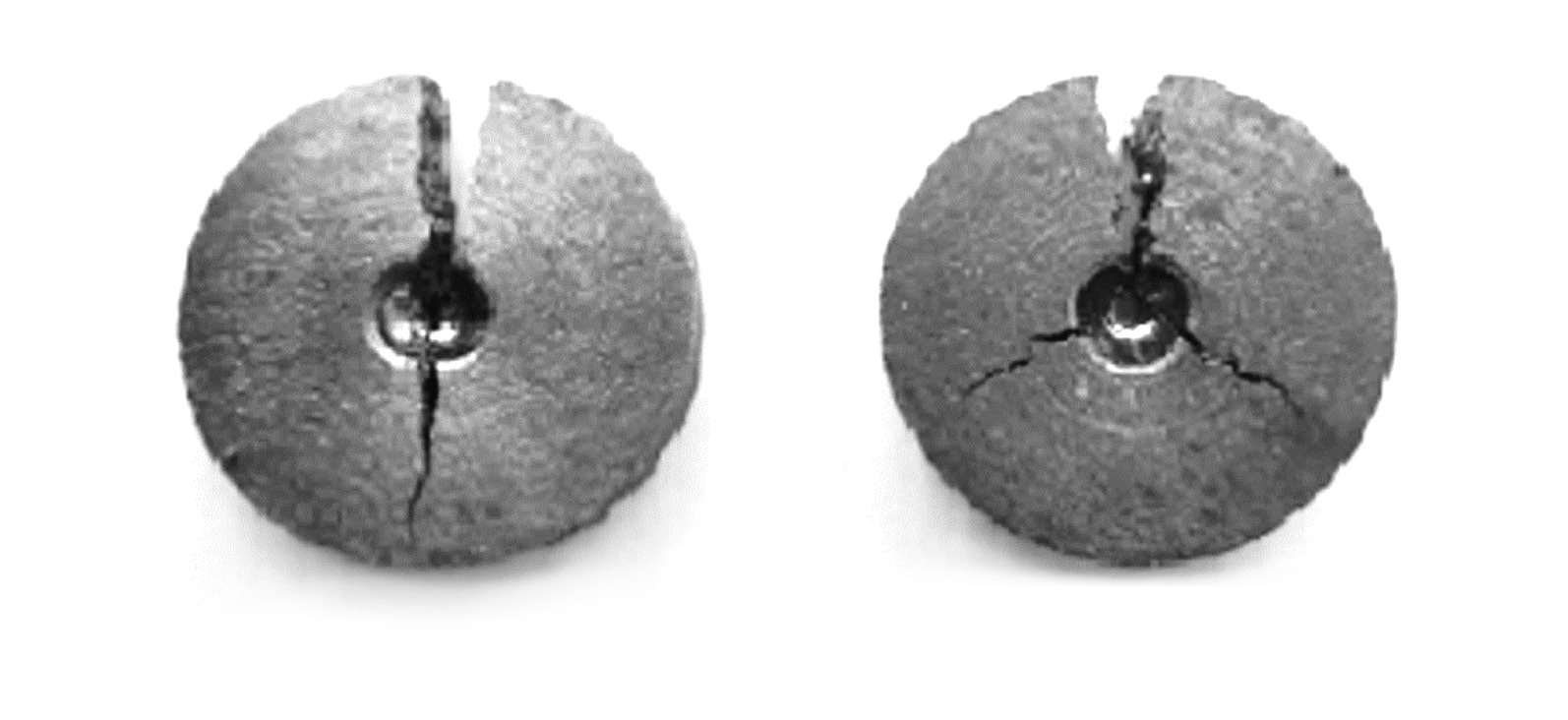 Исследования показали, что разрушение в магнитном поле имеет две важные взаимообусловленные особенности. В большинстве образцов (около 85%) наблюдается распространение одной или двух радиальных трещин в направлении, близком к направлению магнитного поля. Отклонение направления распространения трещины от направления магнитного поля не превышало 10–15°. Остальные радиальные трещины были расположены преимущественно по нормали к силовым линиям магнитного поля.