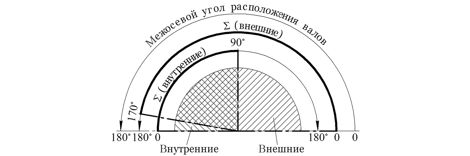 Рис. 1. Ориентировочные границы существования конических передач внешнего и внутреннего зацеплений в зависимости от межосевого угла Σ