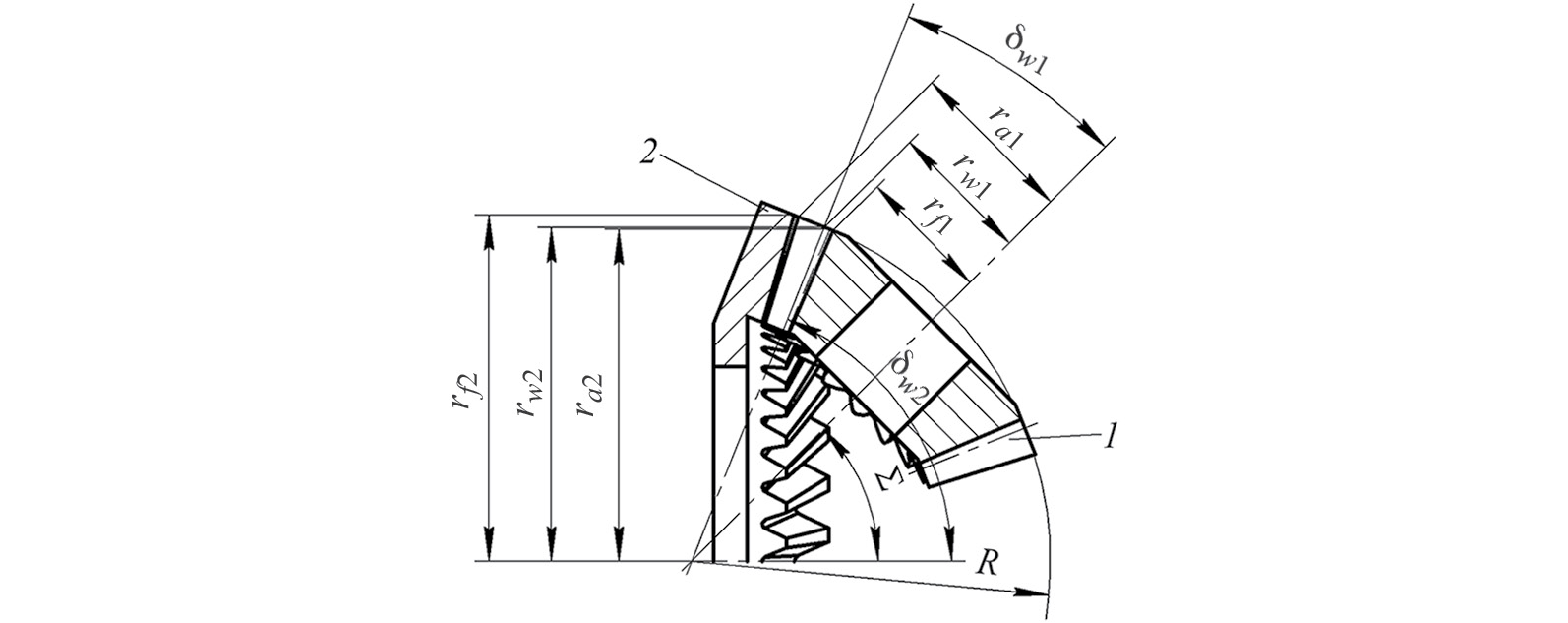 Рис. 2. Геометрические параметры внутреннего конического зацепления: 1 – шестерня; 2 – колесо