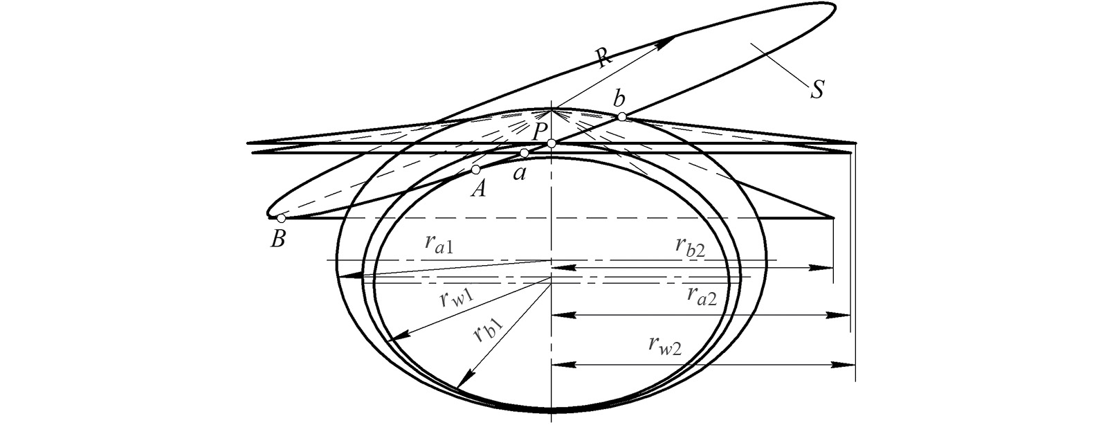 Зависимости для определения этих показателей можно получить из рассмотрения механизма зацепления. На рис. 4 показано образование точек A и B, которые являются касательными точками поверхности S радиуса R к основаниям конусов эволют радиусами rb1 и rb2. Из этих точек отмеряется радиус кривизны эвольвенты шестерни и колеса. При нахождении контакта зубьев в полюсе зацепления P радиусы кривизны эвольвенты шестерни AP и колеса BP будут определяться по формулам