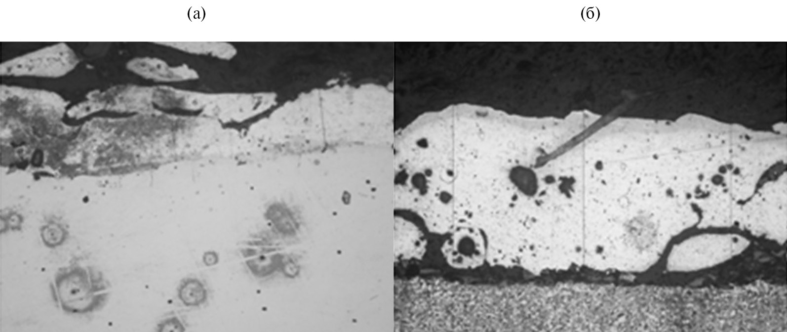 Рис. 2. Микроструктура электроискровых покрытий БрО10С10 и БрО10С10 + 0.1% УНТ: (а) – покрытие из электрода БрО10С10; (б) – покрытие из электрода БрО10С10 + 0.1% УНТ.