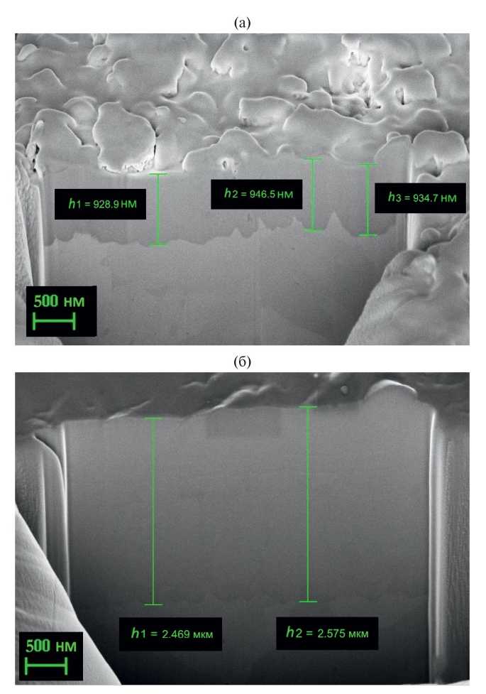 Рис. 2. Структура ионно-плазменных покрытий CrTiZrNbHf различной толщины, СЭМ, кросс-секции: (а) — тонкое покрытие толщиной h ≈ 1.0 мкм после обработки по поверхности галлиевым ионным пучком; (б) — покрытие толщиной h = 2.5 мкм.