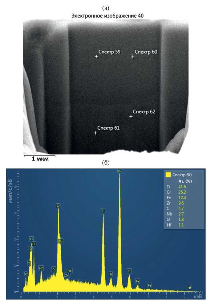 Рис. 3. Элементный состав ионно-плазменного покрытия CrTiZrNbHf толщиной h = 2.6 мкм: (а) — расположение точечных сканов EDAX на поверхности кросс-секции; (б) — энергограмма распределения элементов (ат. %) в области точечного зондирования покрытия «Спектр 60».