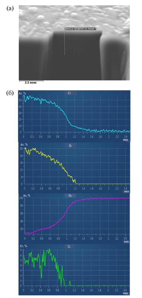 Рис. 4. Пример распределения основных элементов (ат. %) по глубине покрытия CrTiZrNbHf толщиной h = 0.9 мкм на поверхности кросс-секции: (а) — электронное изображение с линией профиля 1, размещенной на поверхности кросс-секции; (б) — распределение Cr, Zr, Fe, Ti вдоль линии профиля 1 от поверхности покрытия в глубину.