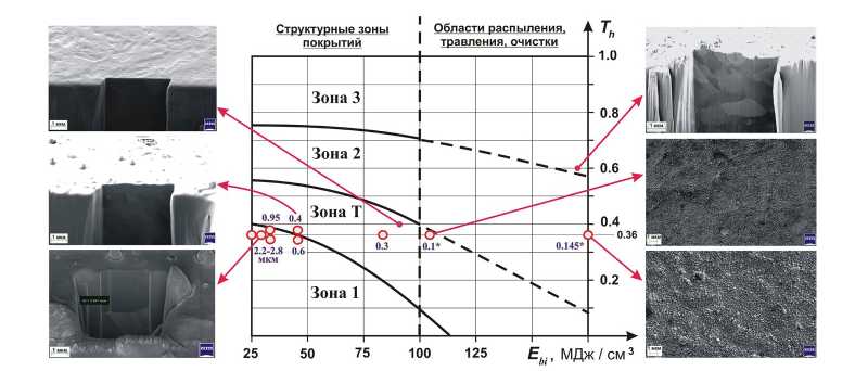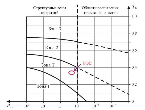 Процесс формирования покрытия и его структуры характеризуется целым рядом технологических параметров, которые взаимно связаны друг с другом. К таким параметрам относятся ток Id и напряжение Ud разряда на катоде, напряжение смещения Us, плотность ионного тока подложки is, температура подложки Тs, скорость осаждения aD и др. Помимо большого количества параметров, каждый из которых оказывает существенное влияние на структуру и свойства покрытий, сложность состоит еще и в том, что каждая комбинация этих параметров дает только одну дискретную структуру. Фактически невозможно, изменяя один параметр процесса в этой комбинации, непрерывно менять структуру осажденной пленки. В этом заключена одна из главных причин, почему формирование пленки с заданной структурой (т. е. и с заданными свойствами) является пока нерешенной проблемой. Поэтому рис. 5 также не дает полного представления о возможностях управления процессом нанесения покрытий ВЭС и оптимизации их структуры по причине малого количества используемых параметров (всего два: Th и РТ) и довольно узкой области их распределения на плоскости диаграммы.