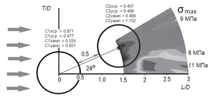 На рис. 1 проведены линии постоянных значений амплитуд величин коэффициентов подъемной силы при условиях обтекания соответствующих числу Рейнольдса Re = 61000 и максимальные напряжения на второй трубе на этих линиях.