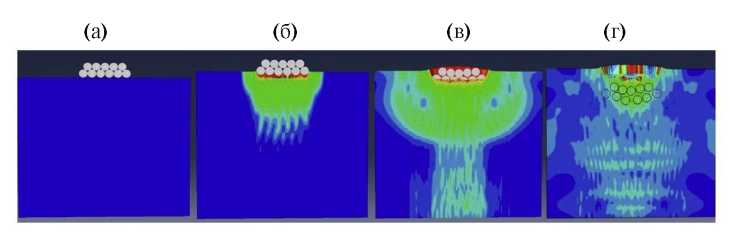 Рис. 2. Имплантация WC-наночастиц в сплав АД1 под действием ЛУВ: (а) — t = 0 нс; (б) — t = 1000 нс; (в) — t = 1500 нс; (г) — t = 4000 нс.
