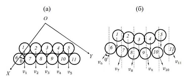 Схематизация столкновения между наночастицами. Принимаем, что столкновение между наночастицами происходит нецентральным способом, которое схематично показано на рис. 4. Принимаем, что при нагружении лазерной ударной волной все шары в верхнем слое получают одинаковую начальную скорость, т. е. v1 = v2 = v3 = = v4 = v5 = v. Принимается также, что массы всех наночастиц одинаковы, т. е. m1 = m2 = … = m10 = m11 = m. Тогда коэффициент восстановления скорости e будет варьироваться в диапазоне 0.3–0.7 [11]. В этом случае скорости, например, восьмого и девятого шаров после столкновения (v8 и v9), находящихся во втором слое, можно определить следующим образом [12]: