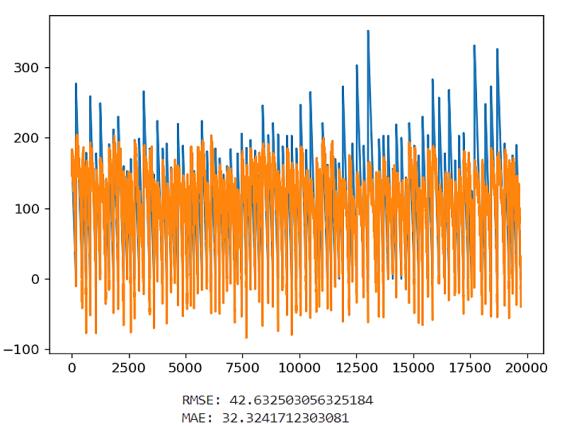 Настоящий фреймворк применялся для анализа временных рядов на примере задач NASA (https://www.kaggle.com/datasets/behrad3d/nasa-cmaps) для определения оставшегося срока службы (RUL) в наборе тестовых данных. В частности, для решения задачи на данных NASA были установлены значения, представленные в таблице 2, в соответствии с функциями фреймворка и выделенными ранее шагами. Сначала производятся импорт необходимых модулей и функций из различных библиотек и загрузка данных из файла train_FD001.csv с агрегированными данными рабочих циклов [19]. Затем в качестве этапа предобработки данных удаляются малоинформативные для анализа столбцы и исходный датафрейм raw_data преобразуется в список точек data с использованием метода скользящего окна, при этом размер окна задан значением параметра, равным 10. Обучается модель линейной регрессии с применением кросс-валидации (разделение имеющегося набора данных на пять частей). Для оценки качества прогноза использованы метрики точности и средняя величина ошибки – RMSE и MAE соответственно. Результаты оценки и график с прогнозными значениями данных NASA приведены на рисунке 4 (синим цветом отмечены реальные значения, оранжевым – полученные в результате прогнозирования).