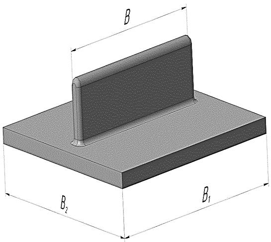 Рис. 1. Металлическое изделие геометрической формы типа стенка: B – длина наплавляемого слоя; B1 и B2 – длина и ширина основания изделия
